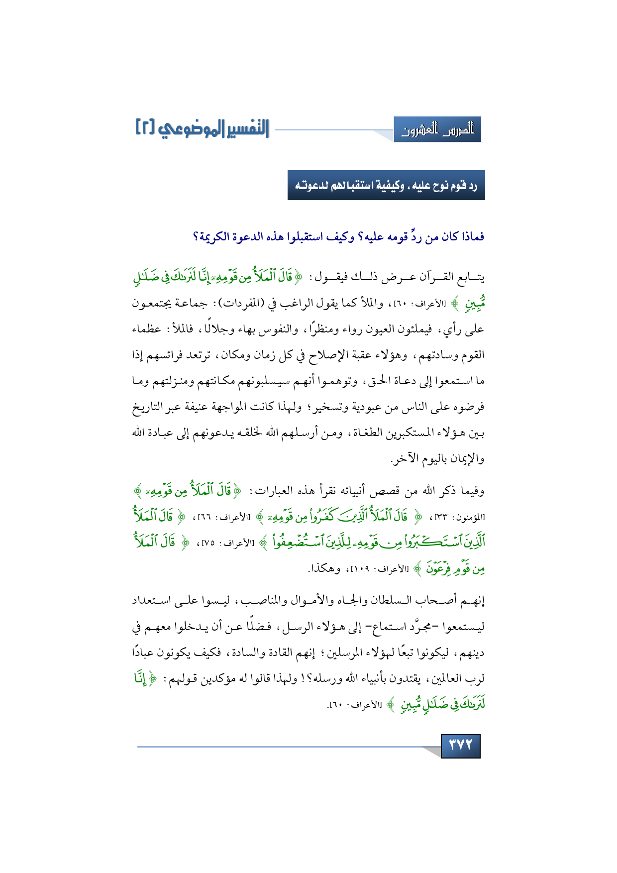 وفيما ذكر الله من قصص أنبيائه تقرأ هذه العبارات: {قَالَ الْمَلَأُ مِنْ قَوْمِهِ} (المؤمنون: 33)، {قَالَ الْمَلَأُ الَّذِينَ كَفَرُوا مِنْ قَوْمِهِ} (الأعراف: 66)، {قَالَ الْمَلَأُ الَّذِينَ اسْتَكْبَرُوا مِنْ قَوْمِهِ لِلَّذِينَ اسْتُضْعِفُوا} (الأعراف: 75)، {قَالَ الْمَلَأُ مِنْ قَوْمِ فِرْعَوْنَ} (الأعراف: 109)، وهكذا، إنهم أصحاب السلطان والجاه والأموال والمناصب، ليسو على استعداد ليستمعوا مجرَّد استماع إلى هؤلاء الرسل، فضلًا عن أن يدخلوا معهم في دينهم، ليكونوا تبعًا لهؤلاء المرسلين، إنهم القادة والسادة، فكيف يكونون عبادًا لرب العالمين يقتدون بأنبياء الله ورسله؟! ولهذا قالوا له مؤكدين قولهم: {إِنَّا لَنَرَاكَ فِي ضَلَالٍ مُبِينٍ} (الأعراف: 60).