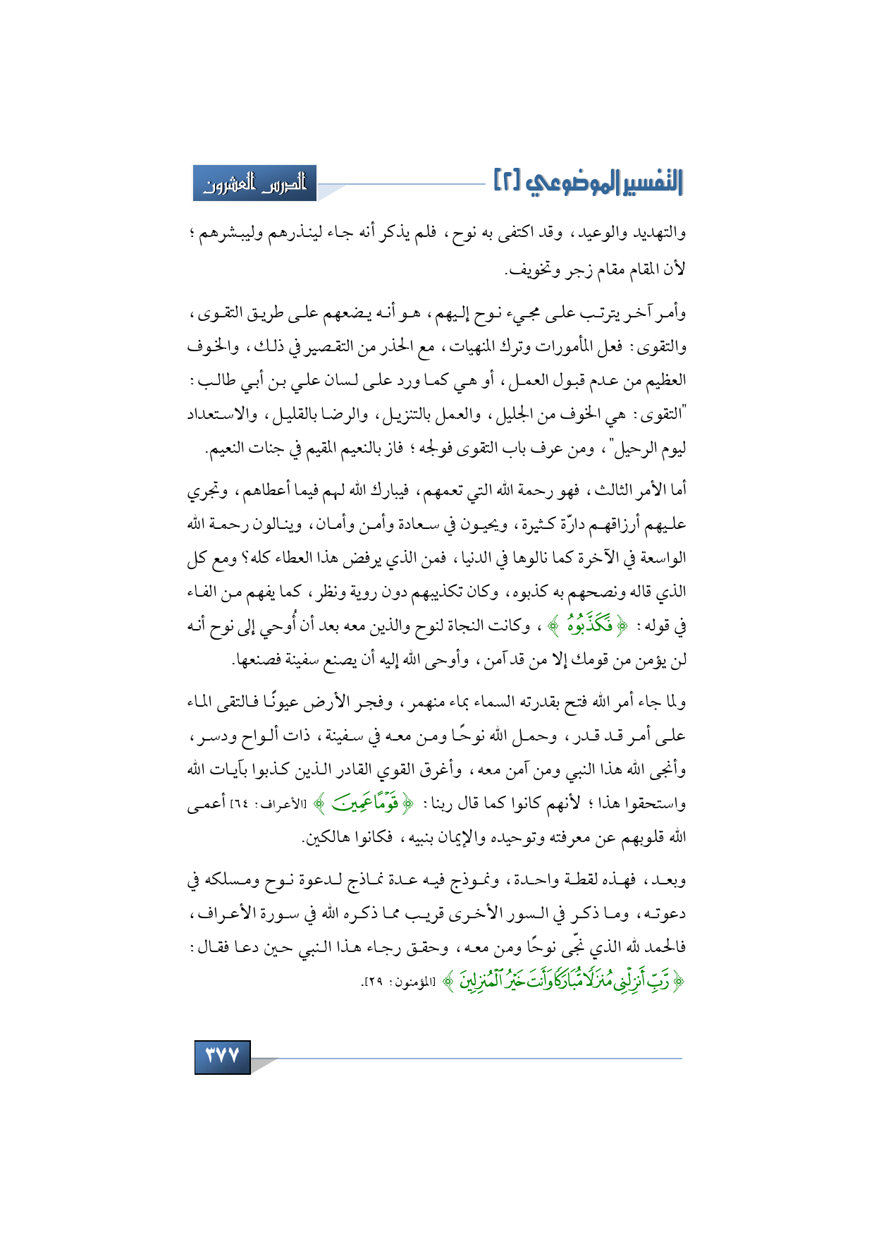 أما الأمر الثالث: فهو رحمة الله التي تعمهم، فيبارك الله لهم فيما أعطاهم، وتجري عليهم أرزاقهم دارة كثيرة، ويحيون في سعادة وأمن وأمان، وينالون رحمة الله الواسعة في الآخرة كما نالوها في الدنيا، فمن الذي يرفض هذا العطاء كله، ومع كل الذي قاله ونصحهم به كذبوه، وكان تكذيبهم دون روية ونظر، كما يفهم من الفاء في قوله: "فكذبوه"، وكانت النجاة لنوح والذين معه بعد أن أُوحِيَ إِلَى نُوحٍ أَنَّهُ لَنْ يُؤْمِنَ مِنْ قَوْمِكَ إِلاَّ مَنْ قَدْ آمَنَ، وأوحى الله إليه أن يصنع سفينة فصنعها، ولما جاء أمر الله فتح بقدرته السماء بماء منهمر، وفجر الأرض عيونًا فالتقى الماء على أمر قد قدر، وحمل الله نوحًا ومن معه في سفينة، ذات ألواح ودسر، وأنجى الله هذا النبي ومن آمن معه، وأغرق القوي القادر الذين كذبوا بآيات الله واستحقوا هذا لأنهم كانوا كما قال ربنا: {قَوْمًا عَمِينَ} (الأعراف: 64) أعمى الله قلوبهم عن معرفته وتوحيده والإيمان بنبيه، فكانوا هالكين.