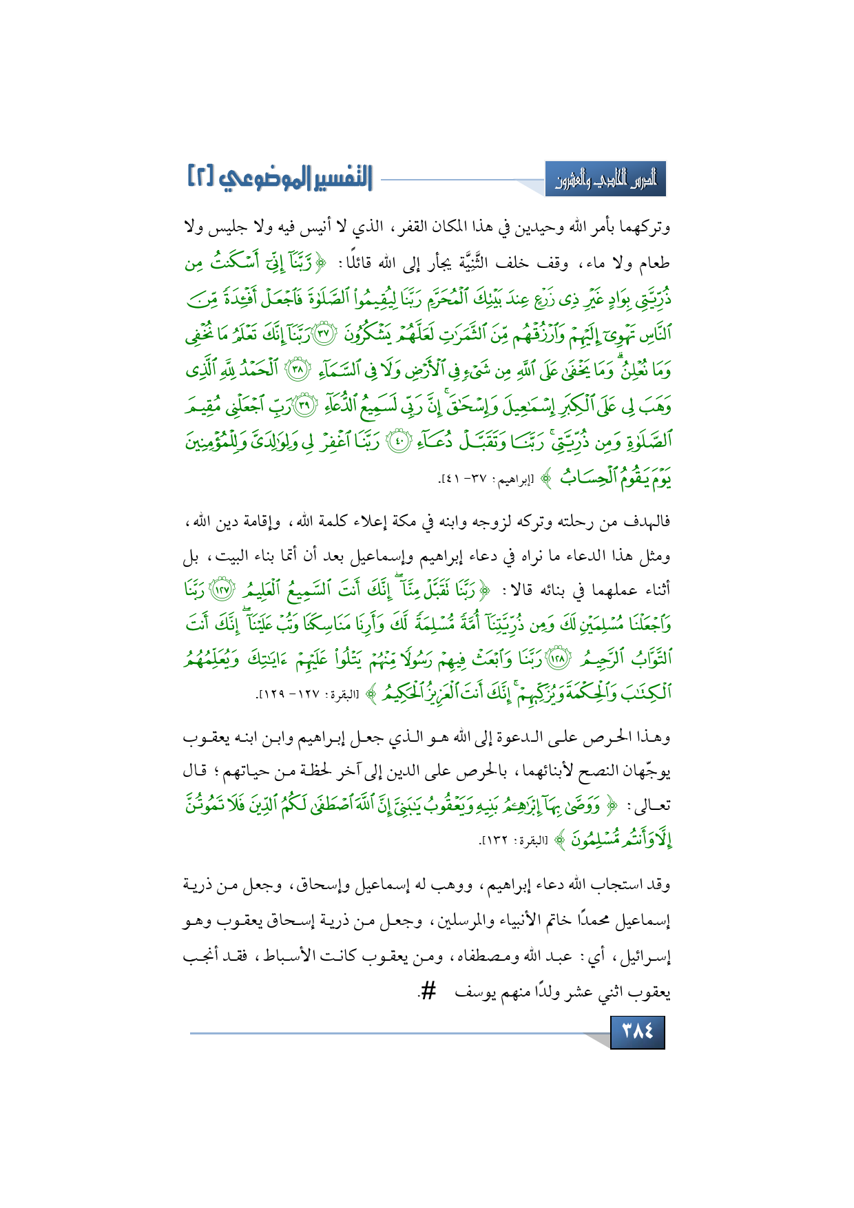فالهدف من رحلته وتركه لزوجه وابنه في مكة إعلاء كلمة الله، وإقامة دين الله، ومثل هذا الدعاء ما نراه في دعاء إبراهيم وإسماعيل بعد أن أتما بناء البيت، بل أثناء عملهما في بنائه قالا: {رَبَّنَا تَقَبَّلْ مِنَّا إِنَّكَ أَنْتَ السَّمِيعُ الْعَلِيمُ * رَبَّنَا وَاجْعَلْنَا مُسْلِمَيْنِ لَكَ وَمِنْ ذُرِّيَّتِنَا أُمَّةً مُسْلِمَةً لَكَ وَأَرِنَا مَنَاسِكَنَا وَتُبْ عَلَيْنَا إِنَّكَ أَنْتَ التَّوَّابُ الرَّحِيمُ * رَبَّنَا وَابْعَثْ فِيهِمْ رَسُولًا مِنْهُمْ يَتْلُو عَلَيْهِمْ آيَاتِكَ وَيُعَلِّمُهُمُ الْكِتَابَ وَالْحِكْمَةَ وَيُزَكِّيهِمْ إِنَّكَ أَنْتَ الْعَزِيزُ الْحَكِيمُ} (البقرة: 127 - 129).