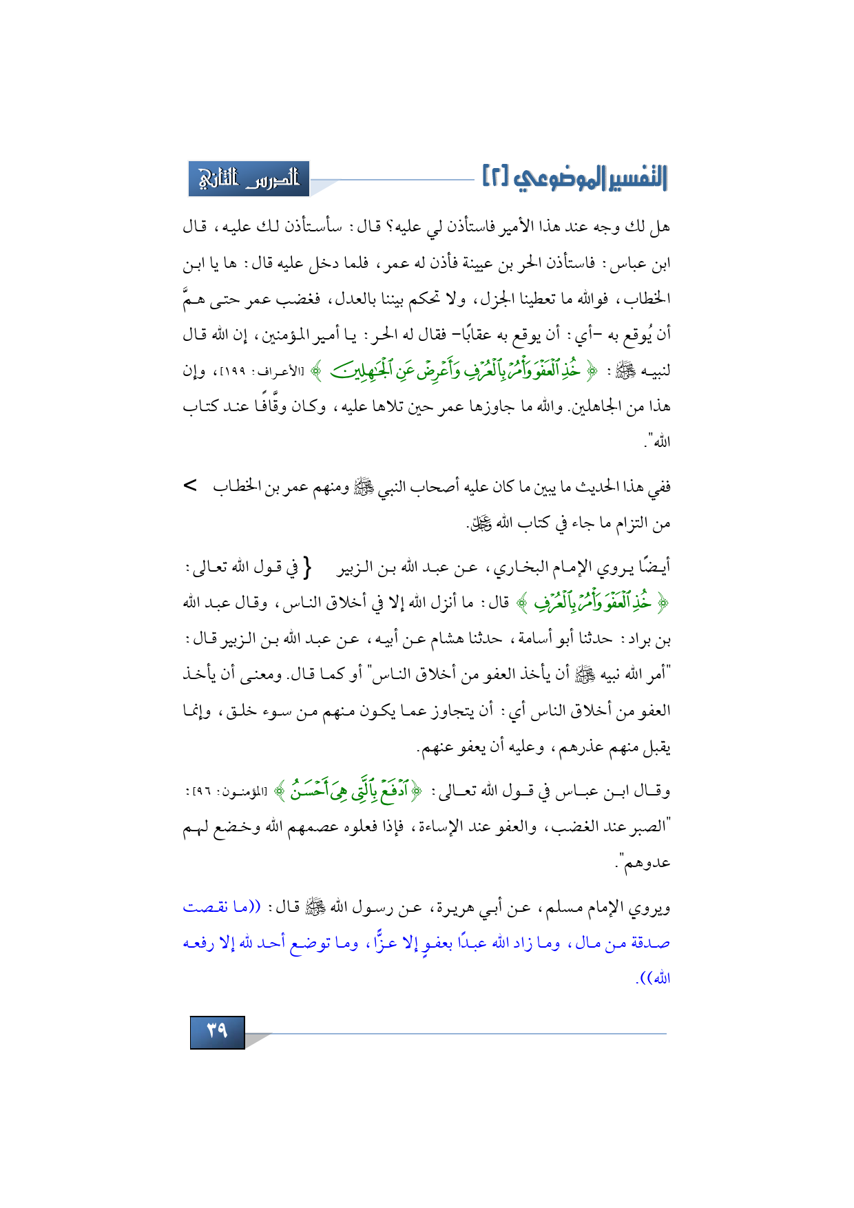 أيضًا يروي الإمام البخاري عن عبد الله بن الزبير -رضي الله تعالى عنهما- في قول الله تعالى: {خُذِ الْعَفْوَ وَأْمُرْ بِالْعُرْفِ} قال: ما أنزل الله إلا في أخلاق الناس، وقال عبد الله بن براد: حدثنا أبو أسامة، حدثنا هشام عن أبيه عن عبد الله بن الزبير قال: "أمر الله نبيه -صلى الله عليه وسلم- أن يأخذ العفو من أخلاق الناس" أو كما قال. ومعنى أن يأخذ العفو من أخلاق الناس أي: أن يتجاوز عما يكون منهم من سوء خلق، وإنما يقبل منهم عذرهم، وعليه أن يعفو عنهم، وقال ابن عباس في قول الله تعالى: {ادْفَعْ بِالَّتِي هِيَ أَحْسَن} (المؤمنون: 96): "الصبر عند الغضب، والعفو عند الإساءة، فإذا فعلوك عصمهم الله وخضع لهم عدوهم".