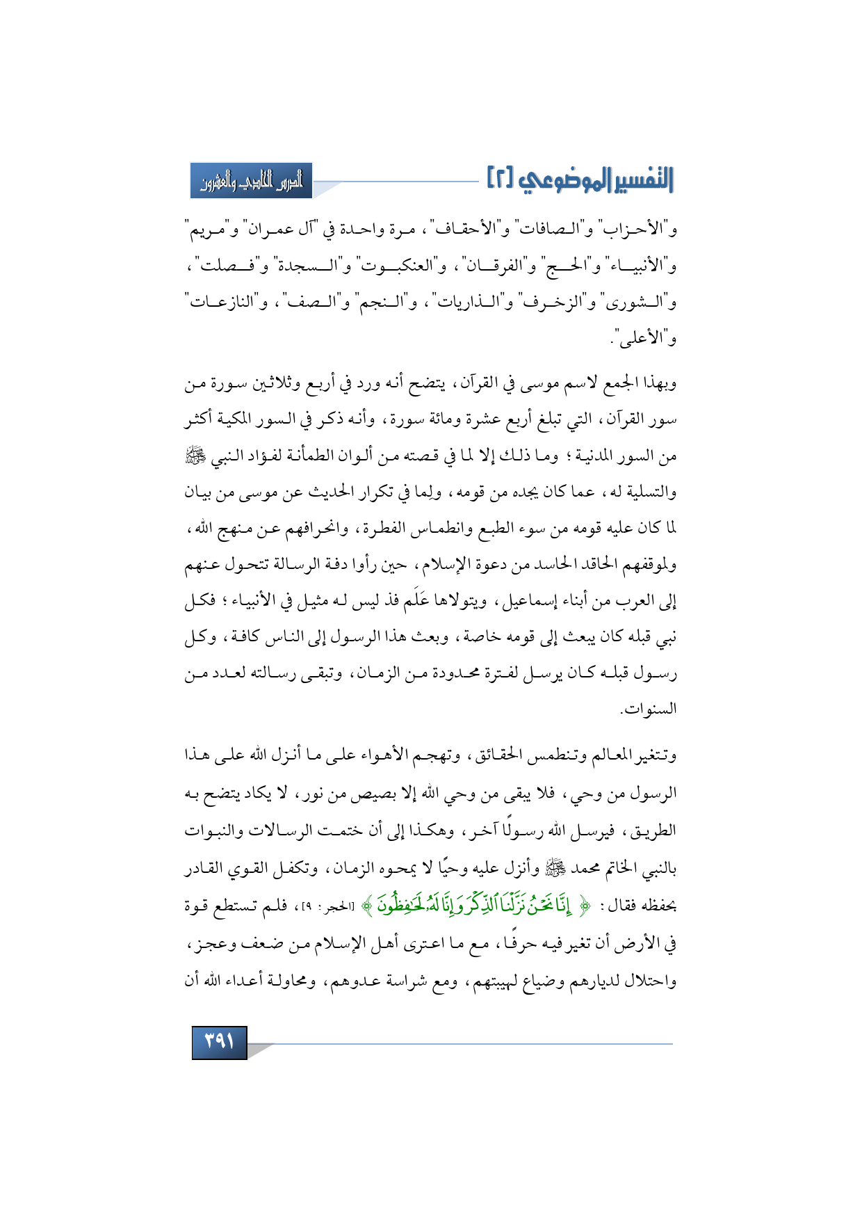 وبهذا الجمع لاسم موسى في القرآن، يتضح أنه ورد في أربع وثلاثين سورة من سور القرآن، التي تبلغ أربع عشرة ومائة سورة، وأنه ذكر في السورة المكية أكثر من السور المدنية، وما ذلك إلا لما في قصته من ألوان التطمين لفؤاد النبي -صلى الله عليه وسلم- والتسلية له، عما كان يجده من قومه، ولِما في تكرار الحديث عن موسى من بيان لما كان عليه قومه من سوء الطبع وانطماس الفطرة، وانحرافهم عن منهج الله، ولموقفهم الحاقد الحاسد من دعوة الإسلام، حين رأوا دفة الرسالة تتحول عنهم إلى العرب من أبناء إسماعيل، ويتولاها عَلَم فذ ليس له مثيل في الأنبياء.