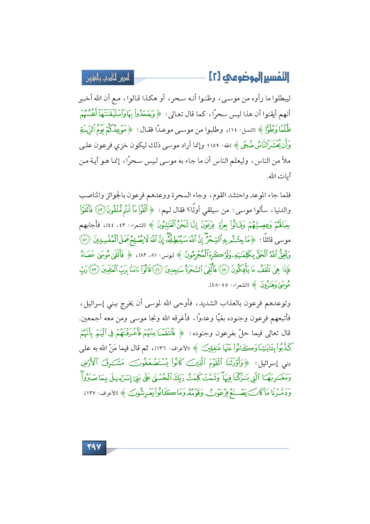 وإنما أراد موسى ذلك ليكون خزي فرعون على ملأ من الناس، وليعلم الناس أن ما جاء به موسى ليس سحرًا، إنما هو آية من آيات الله، فلما جاء الموعد واحتشد القوم، وجاء السحرة ووعدهم فرعون بالجوائز والمناصب والدنيا، وسألوا موسى من سيلقي أولًا؟ فقال لهم: {أَلْقُوا مَا أَنْتُمْ مُلْقُونَ * فَأَلْقَوْا حِبَالَهُمْ وَعِصِيَّهُمْ وَقَالُوا بِعِزَّةِ فِرْعَوْنَ إِنَّا لَنَحْنُ الْغَالِبُونَ} (الشعراء: 43، 44) فأجابهم موسى قائلًا: {مَا جِئْتُمْ بِهِ السِّحْرُ إِنَّ اللَّهَ سَيُبْطِلُهُ إِنَّ اللَّهَ لَا يُصْلِحُ عَمَلَ الْمُفْسِدِينَ * وَيُحِقُّ اللَّهُ الْحَقَّ بِكَلِمَاتِهِ وَلَوْ كَرِهَ الْمُجْرِمُونَ} (يونس: 81، 82) {فَأَلْقَى مُوسَى عَصَاهُ فَإِذَا هِيَ تَلْقَفُ مَا يَأْفِكُونَ * فَأُلْقِيَ السَّحَرَةُ سَاجِدِينَ * قَالُوا آمَنَّا بِرَبِّ الْعَالَمِينَ * رَبِّ مُوسَى وَهَارُونَ} (الشعراء: 45 - 48).