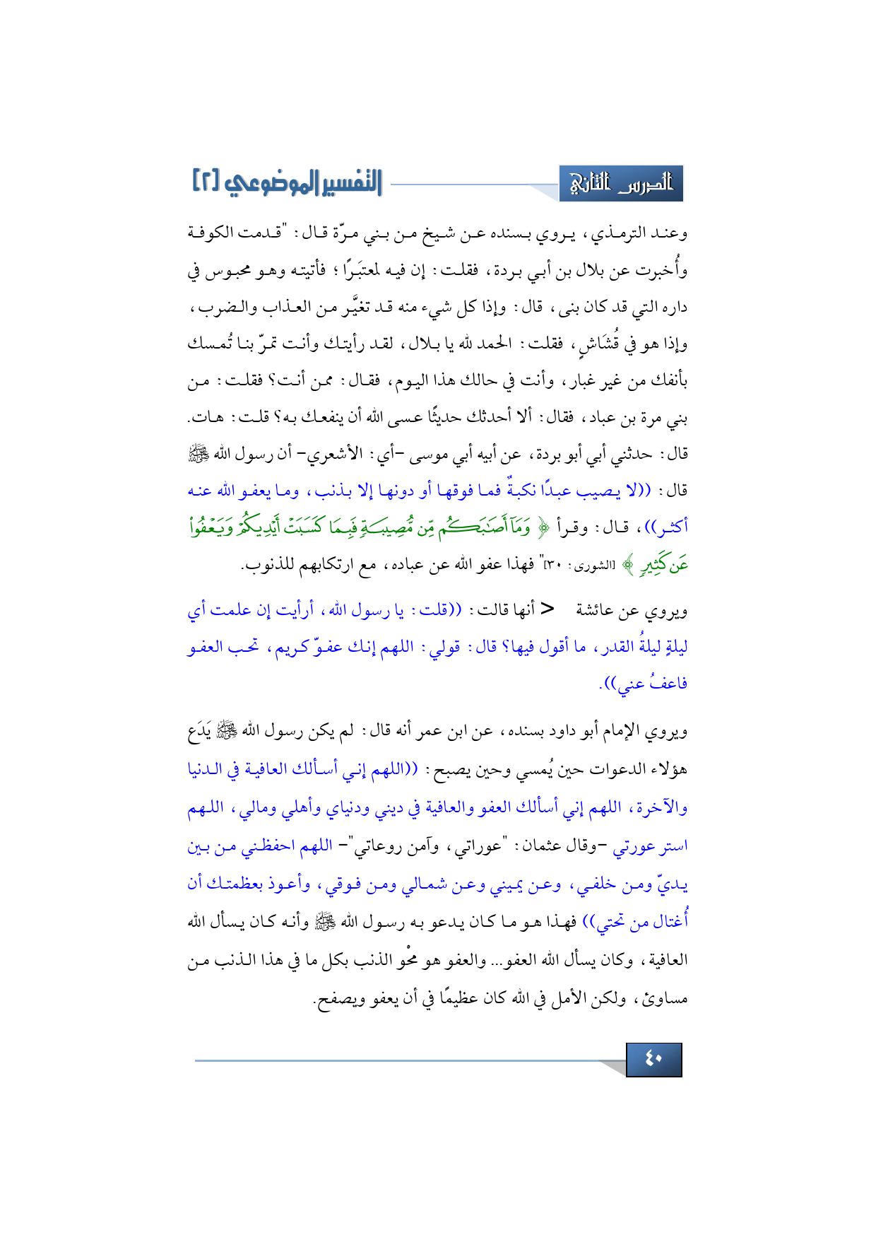 فهذا عفو الله عن عباده مع ارتكابهم للذنوب، ويروي عن عائشة -رضي الله تعالى عنها- أنها قالت: ((قلت يا رسول الله: أرأيت أن علمت أي ليلة ليلةُ القدر ما أقول فيها قال: قولي اللهم إنك عفوّ كريم تحب العفو فاعفُ عني))، ويروي الإمام أبو داود بسنده عن ابن عمر أنه قال: لم يكن رسول الله -صلى الله عليه وسلم- يَدَع هؤلاء الدعوات حين يُمسي وحين يصبح: ((اللهم إني أسألك العافية في الدنيا والآخرة، اللهم إني أسألك العفو والعافية في ديني ودنياي وأهلي ومالي، اللهم استر عورتي -وقال عثمان: "عوراتي، وآمن روعاتي"- اللهم احفظني من بين يدي ومن خلفي وعن يميني وعن شمالي ومن فوقي، وأعوذ بعظمتك أن أغتال من تحتي)) فهذا هو ما كان يدعو به رسول الله -صلى الله عليه وسلم-، وأنه كان يسأل الله العافية، وكان يسأل الله العفو ... والعفو هو محو الذنب بكل ما في هذا الذنب من مساوئ، ولكن الأمل في الله كان عظيمًا في أن الله الإله الكريم يعفو ويصفح.