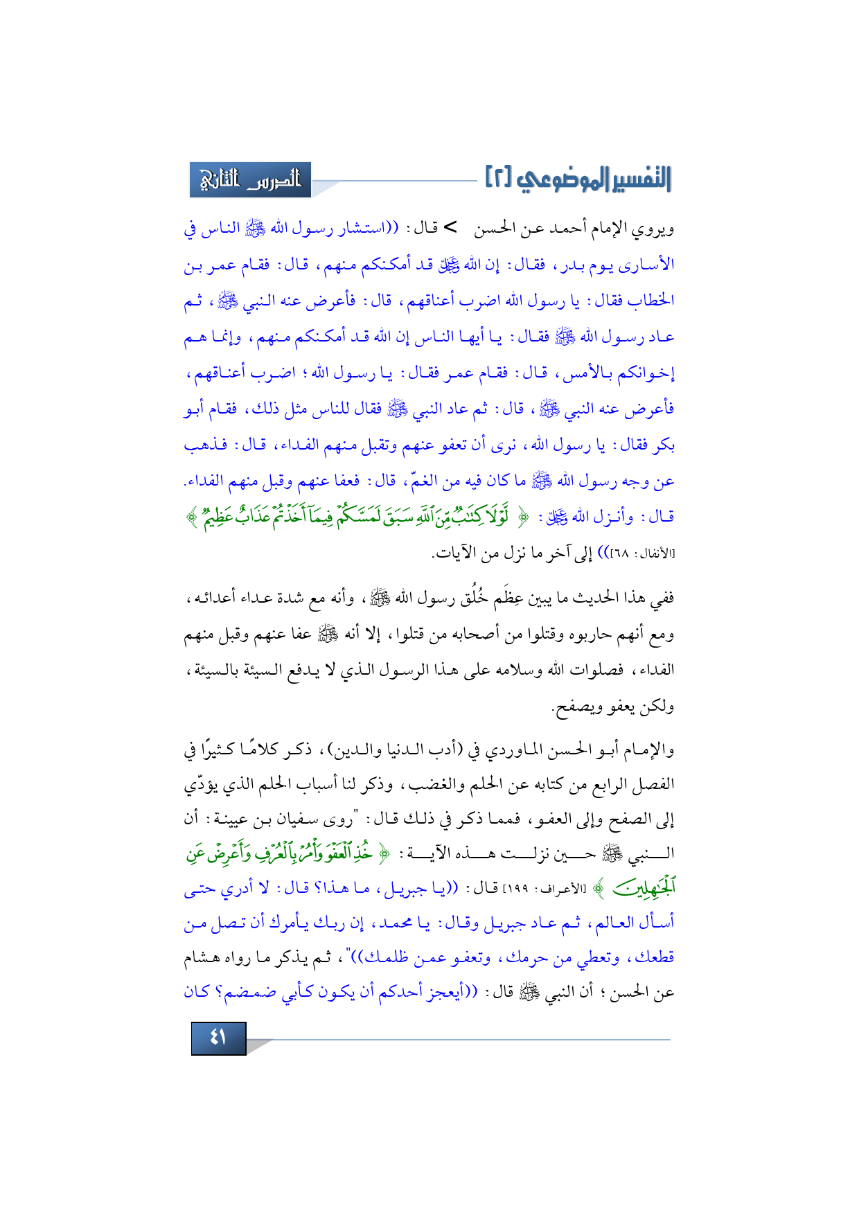 الإمام أبو الحسن الماوردي في (أدب الدنيا والدين)، ذكر كلامًا كثيرًا في الفصل الرابع في كتابه في الحلم والغضب، وذكر لنا أسباب الحلم الذي يؤدّي إلى الصفح وإلى العفو، فمما ذكر في ذلك قال: روى سفيان بن عيينة: أن النبي -صلى الله عليه وسلم- حين نزلت هذه الآية: {خُذِ الْعَفْوَ وَأْمُرْ بِالْعُرْفِ وَأَعْرِضْ عَنِ الْجَاهِلِينَ} (الأعراف: 199) قال: ((يا جبريل ما هذا؟ قال: لا أدري حتى أسأل العالم، ثم عاد جبريل وقال: يا محمد، إن ربك يأمرك أن تصل من قطعك، وتعطي من حرمك، وتعفو عمن ظلمك))، ثم يذكر ما رواه هشام عن الحسن أن النبي -صلى الله عليه وسلم- قال: ((أيعجز أحدكم أن يكون كأبي ضمضم، كان