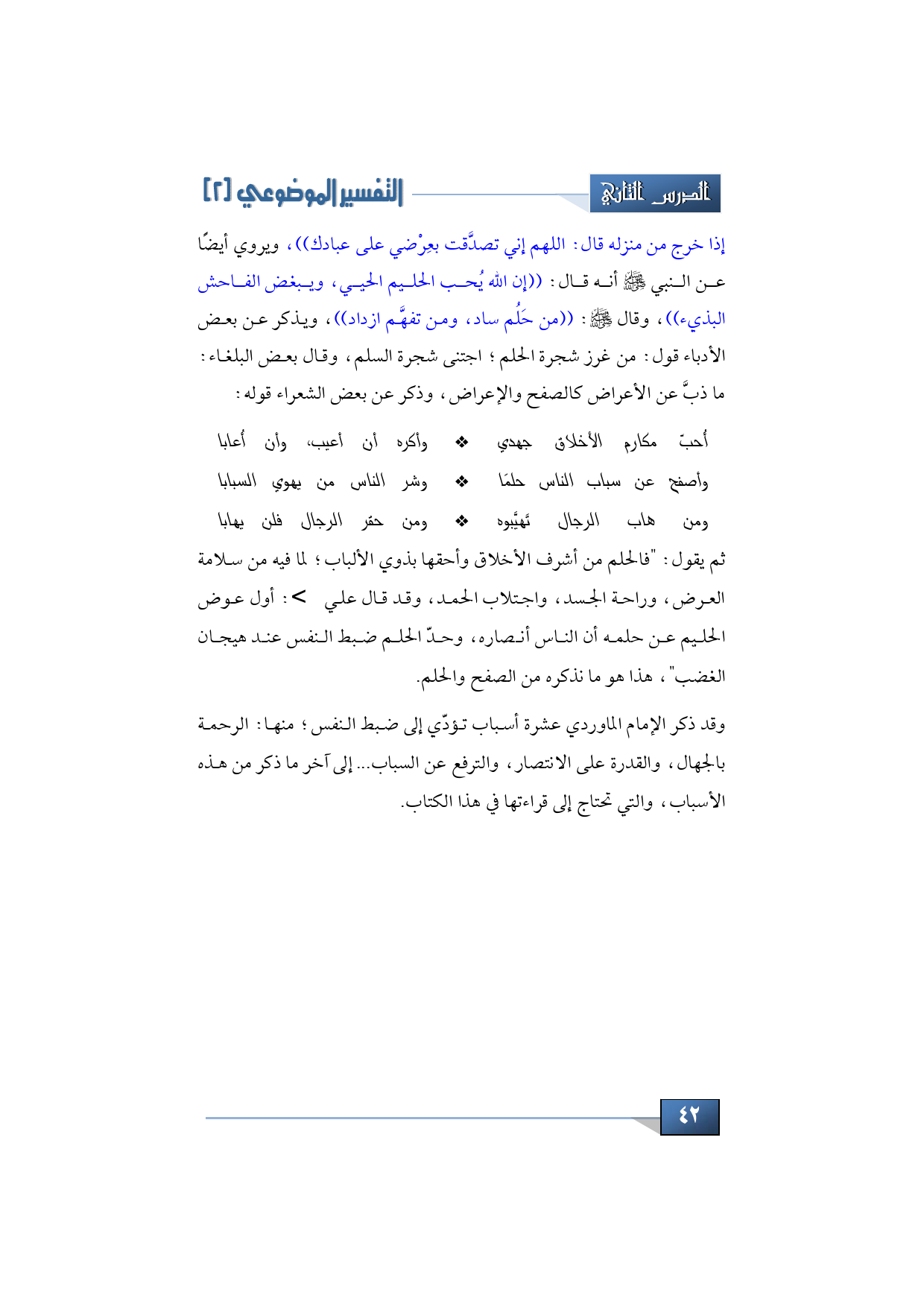 إذا خرج من منزله قال: اللهم إني تصدَّقت بعرضي على عبادك))، ويروي أيضًا عن النبي -صلى الله عليه وسلم- أنه قال: ((إن الله يُحب الحليم الحيي ويبغض الفاحش البذيء))، وقال -عليه الصلاة والسلام-: ((من حَلُم ساد، ومن تفهَّم ازداد))، ويذكر عن بعض الأدباء قول من غرز شجرة الحلم اجتنى شجرة السلم، وقال بعض البلغاء: ما ذبَّ عن الأعراض كالصفح والإعراض، وذكر عن بعض الشعراء قوله: