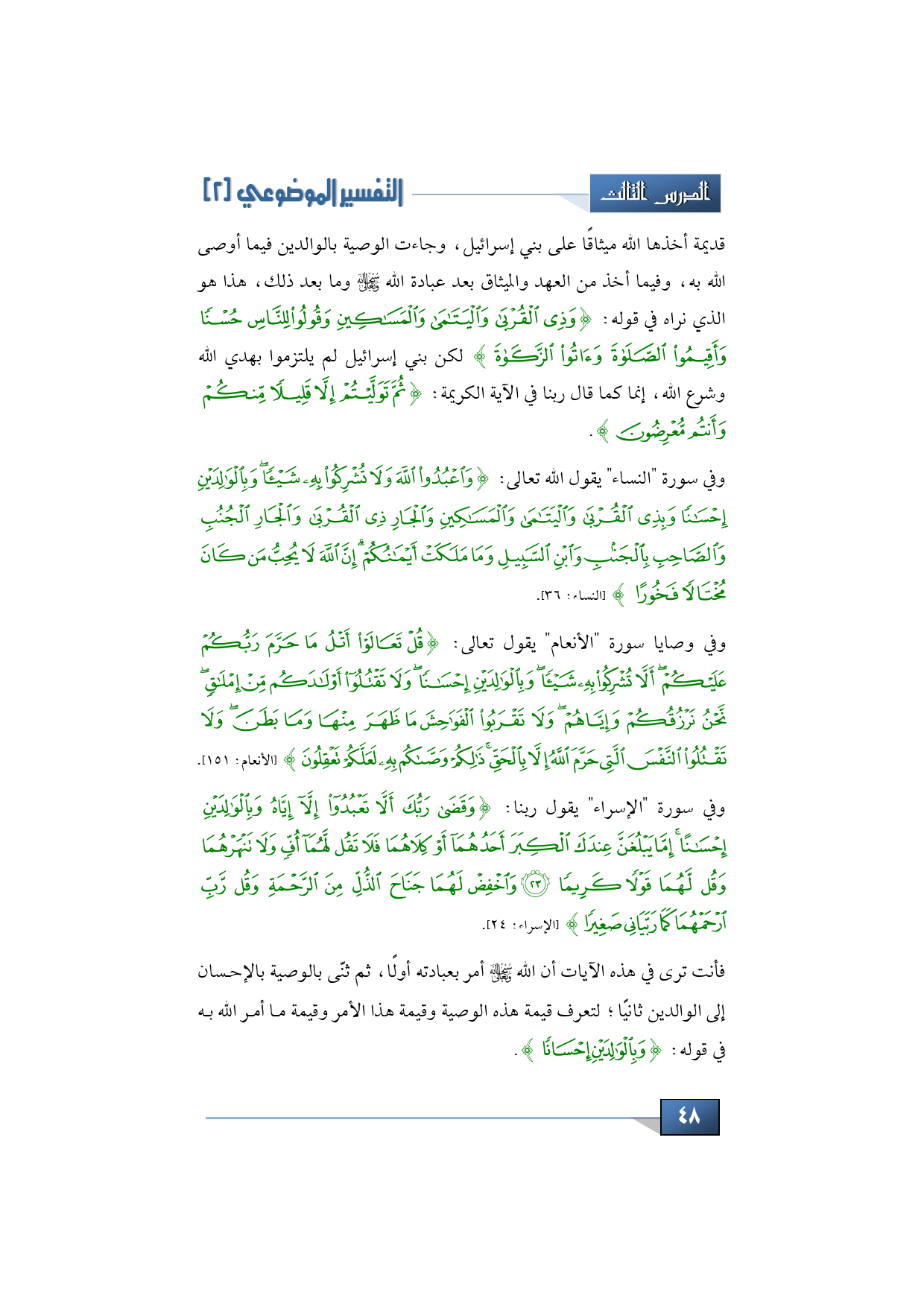 قديمة أخذها الله ميثاقًا على بني إسرائيل، جاءت الوصية جاءت الوصية بالوالدين فيما أوصى الله به وفيما أخذ من العهد والميثاق بعد عبادة الله -سبحانه وتعالى- وما بعد ذلك هذا هو الذي نراه في قوله: {وَذِي الْقُرْبَى وَالْيَتَامَى وَالْمَسَاكِينِ وَقُولُوا لِلنَّاسِ حُسْنًا وَأَقِيمُوا الصَّلَاةَ وَآتُوا الزَّكَاةَ} لكن بني إسرائيل لم يلتزموا بهدي الله وشرع الله، إنما كما قال ربنا في الآية الكريمة: {ثُمَّ تَوَلَّيْتُمْ إِلَّا قَلِيلًا مِنْكُمْ وَأَنْتُمْ مُعْرِضُونَ}.