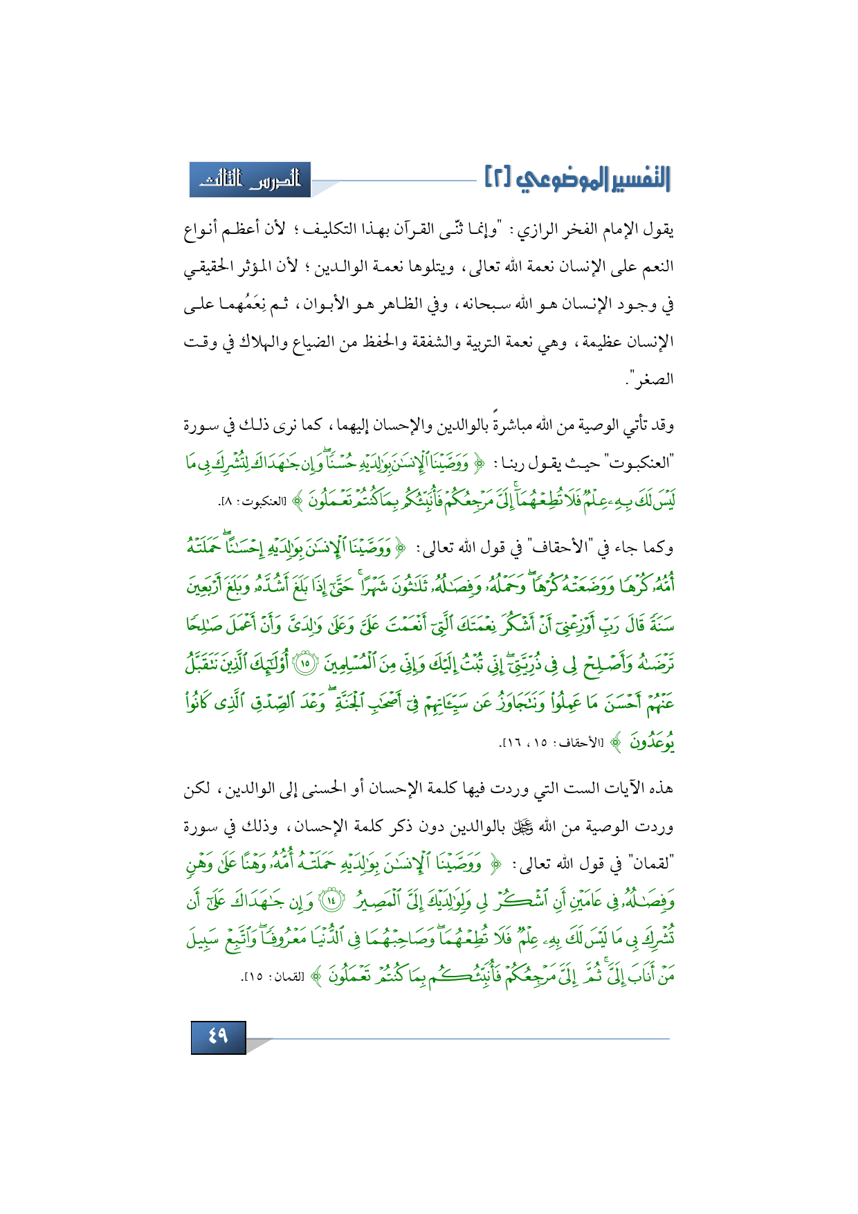 يقول الإمام الفخر الرازي: وإنما ثنى القرآن بهذا التكليف لأن أعظم أنواع النعم على الإنسان نعمة الله تعالى، ويتلوها نعمة الوالدين؛ لأن المؤثر الحقيقي في وجود الإنسان هو الله سبحانه، وفي الظاهر هو الأبوان، ثم نعمهما على الإنسان عظيمة، وهي نعمة التربية والشفقة والحفظ من الضياع والهلاك في وقت الصغر.
