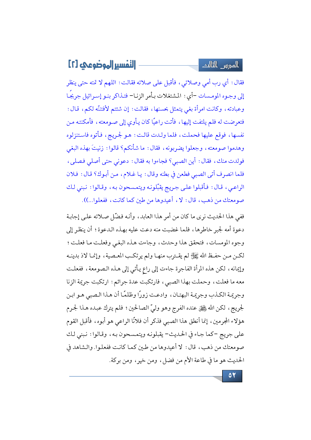 ففي هذا الحديث نرى ما كان من أمر هذا العابد وأنه فضل صلاته على إجابة دعوة أمه لجبر خاطرها، فلما غضبت منه دعت عليه بهذه الدعوة؛ أن ينظر إلى وجوه المومسات، فتحقق هذا وحدث، وجاءت هذه البغي وفعلت ما فعلت؛ لكنه لأنه حفظ الله -سبحانه وتعالى-؛ فلم يقترب منها ولم يرتكب المعصية، وإنما لاذ بدينه وإيمانه، ولكن هذه المرأة الفاجرة جاءت إلى راعٍ يأتي إلى هذه الصومعة ففعلت معه ما فعلت، وحملت بهذا الصبي، فارتكبت عدة جرائم: ارتكبت جريمة الزنا وجريمة الكذب وجريمة البهتان وادعت زورًا وظلمًا أن هذا الصبي هو ابن لجريج، ولكن الله -عز وجل- عنده الفرج وهو ولي الصالحين؛ لم يترك عبده هذا لجرم هؤلاء المجرمين، إنما أنطق هذا الصبي فذكر أن فلانًا الراعي هو أبوه، فأقبل القوم على جريج -كما جاء في الحديث- يقبلونه ويتمسحون به، وقالوا: نبني لك صومعتك من ذهب، قال: لا أعيدوها من طين كما كانت ففعلوا، الشاهد في الحديث -كما رأينا- هو ما في طاعة الأم من فضل ومن خير ومن بركة.