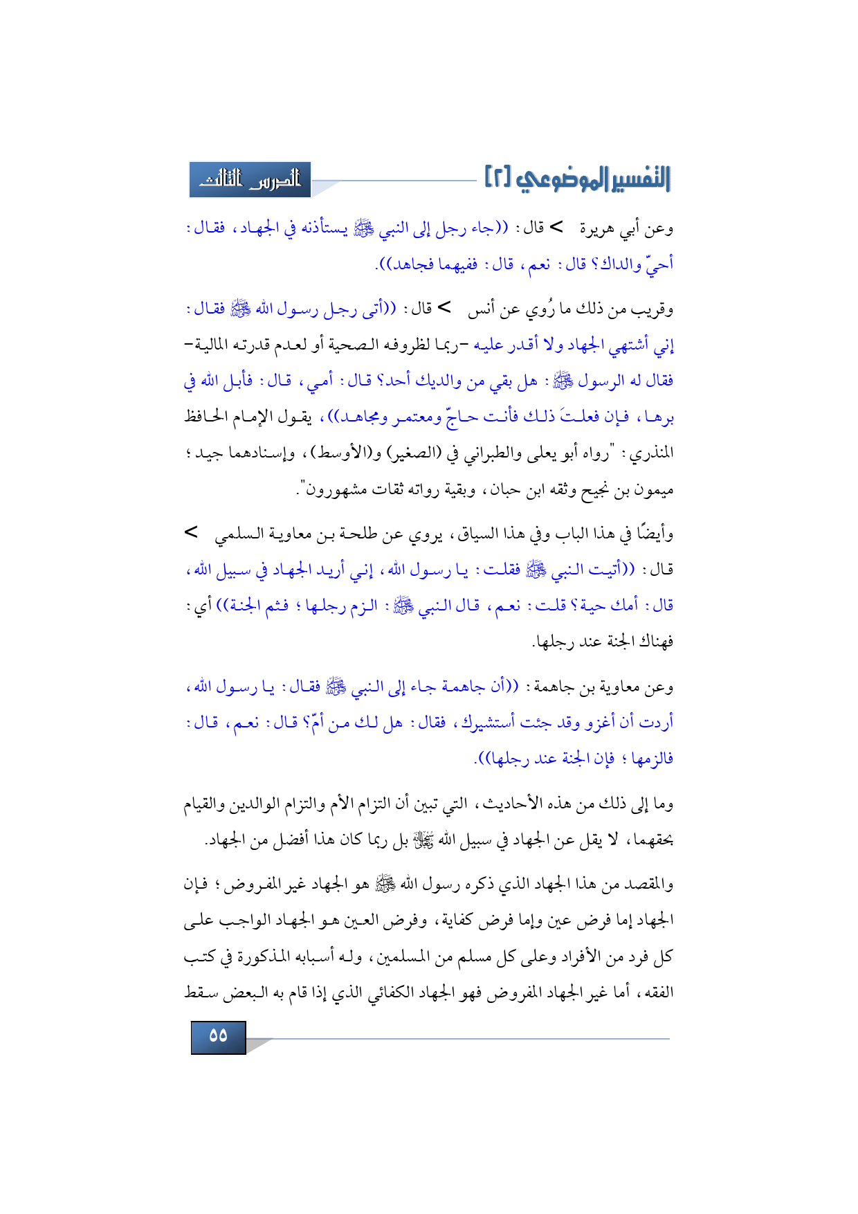 وما إلى ذلك من هذه الأحاديث التي تبين أن التزام الأم والتزام الوالدين والقيام بحقهما لا يقل عن الجهاد في سبيل الله -سبحانه وتعالى- بل ربما كان هذا أفضل من الجهاد.
