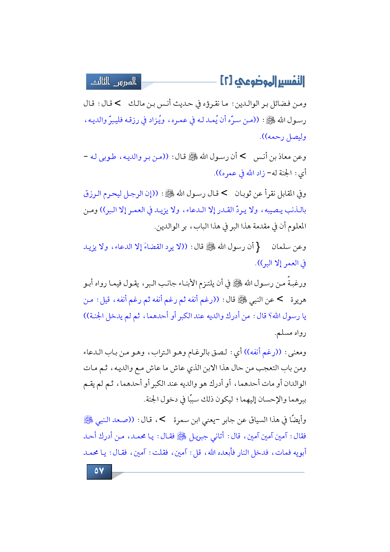ورغبة من رسول الله -صلى الله عليه وسلم- في أن يلتزم الأبناء جانب البر يقول فيما رواه أبو هريرة -رضي الله عنه- عن النبي -صلى الله عليه وسلم- قال: ((رغم أنفه ثم رغم أنفه ثم رغم أنفه، قيل: من يا رسول الله؟ قال: من أدرك والديه عند الكبر أو أحدهما ثم لم يدخل الجنة)) رواه مسلم.