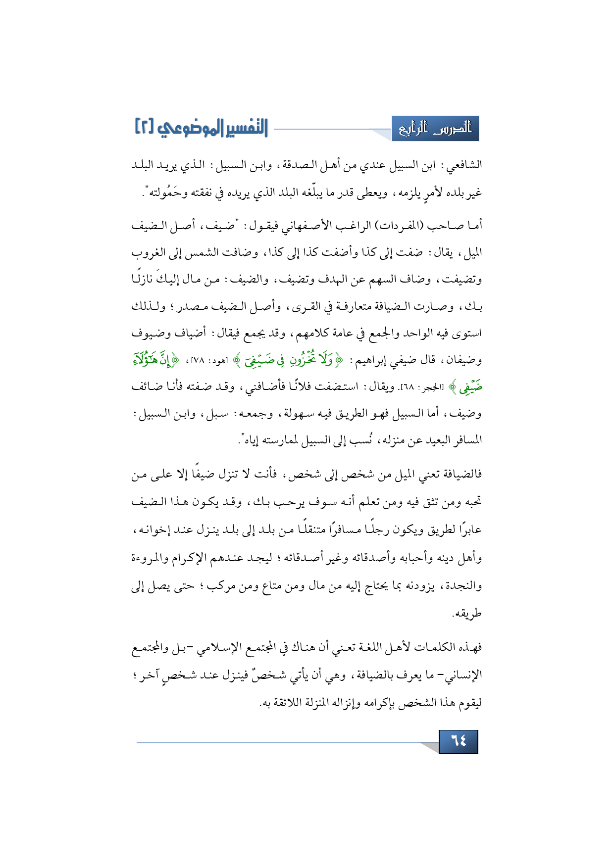 أما صاحب (المفردات) الراغب الأصفهاني فيقول: ضيف أصل الضيف الميل يقال: ضفت إلى كذا وأضفت كذا إلى كذا، وضافت الشمس إلى الغروب وتضيفت، وضاف السهم عن الهدف وتضيف، والضيف: من مال إليك نازلًا بك، وصارت الضيافة متعارفة في القرى، وأصل الضيف مصدر، ولذلك استوى فيه الواحد والجمع في عامة كلامهم، وقد يجمع فيقال: أضياف وضيوف وضيفان، قال ضيفي إبراهيم: {وَلاَ تُخْزُونِ فِي ضَيْفِي} (هود:78) {إِنَّ هَؤُلاء ضَيْفِي} (الحِجر: 68) ويقال: استضفت فلانًا فأضافني، وقد ضفته فأنا ضائف وضيف، أما السبيل فهو الطريق فيه سهولة، وجمعه سبل، وابن السبيل المسافر البعيد عن منزله، نُسب إلى السبيل لممارسته إياه.