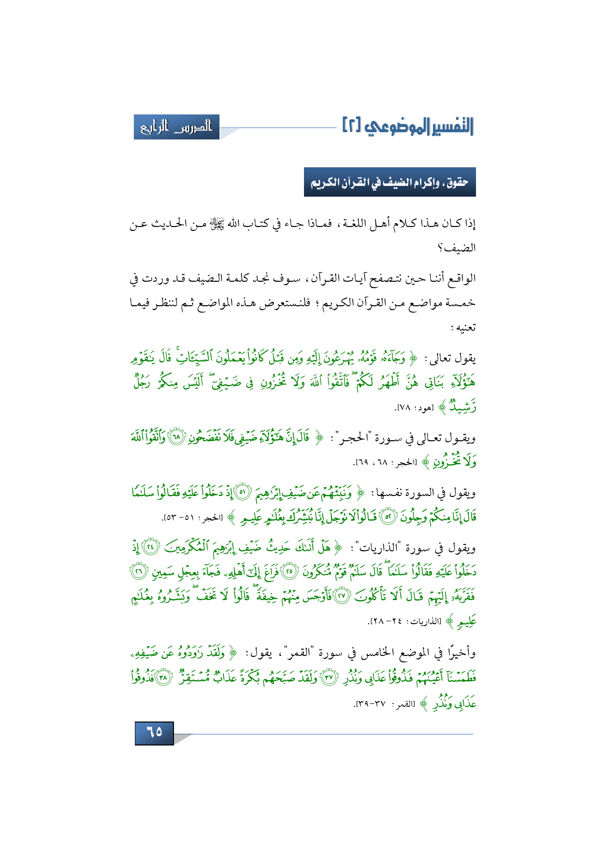 ويقول في سورة "الذاريات": {هَلْ أَتَاكَ حَدِيثُ ضَيْفِ إِبْرَاهِيمَ الْمُكْرَمِينَ إِذْ دَخَلُوا عَلَيْهِ فَقَالُوا سَلَامًا قَالَ سَلَامٌ قَوْمٌ مُنْكَرُونَ فَرَاغَ إِلَى أَهْلِهِ فَجَاءَ بِعِجْلٍ سَمِينٍ فَقَرَّبَهُ إِلَيْهِمْ قَالَ أَلَا تَأْكُلُونَ فَأَوْجَسَ مِنْهُمْ خِيفَةً قَالُوا لَا تَخَفْ وَبَشَّرُوهُ بِغُلَامٍ عَلِيمٍ} (الذاريات: 28).