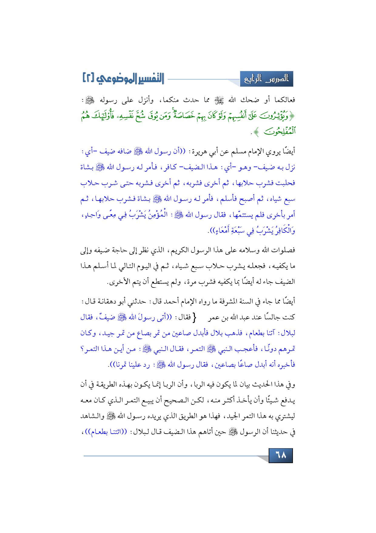 أيضًا يروي الإمام مسلم عن أبي هريرة: ((أن رسول الله -صلى الله عليه وسلم- ضافه ضيف -أي: نزل به ضيف- وهو -أي: هذا الضيف- كافر فأمر له رسول الله -صلى الله عليه وسلم- بشاة فحلبت فشرب حلابها ثم أخرى فشربه ثم أخرى فشربه حتى شرب حلاب سبع شياه، ثم أصبح فأسلم، فأمر له رسول الله -صلى الله عليه وسلم- بشاة فشرب حلابها ثم أمر بأخرى فلم يستتمها، فقال رسول الله -صلى الله عليه وسلم-: الْمُؤْمِنُ يَشْرَبُ فِي مِعًى وَاحِدٍ وَالْكَافِرُ يَشْرَبُ فِي سَبْعَةِ أَمْعَاءٍ)).