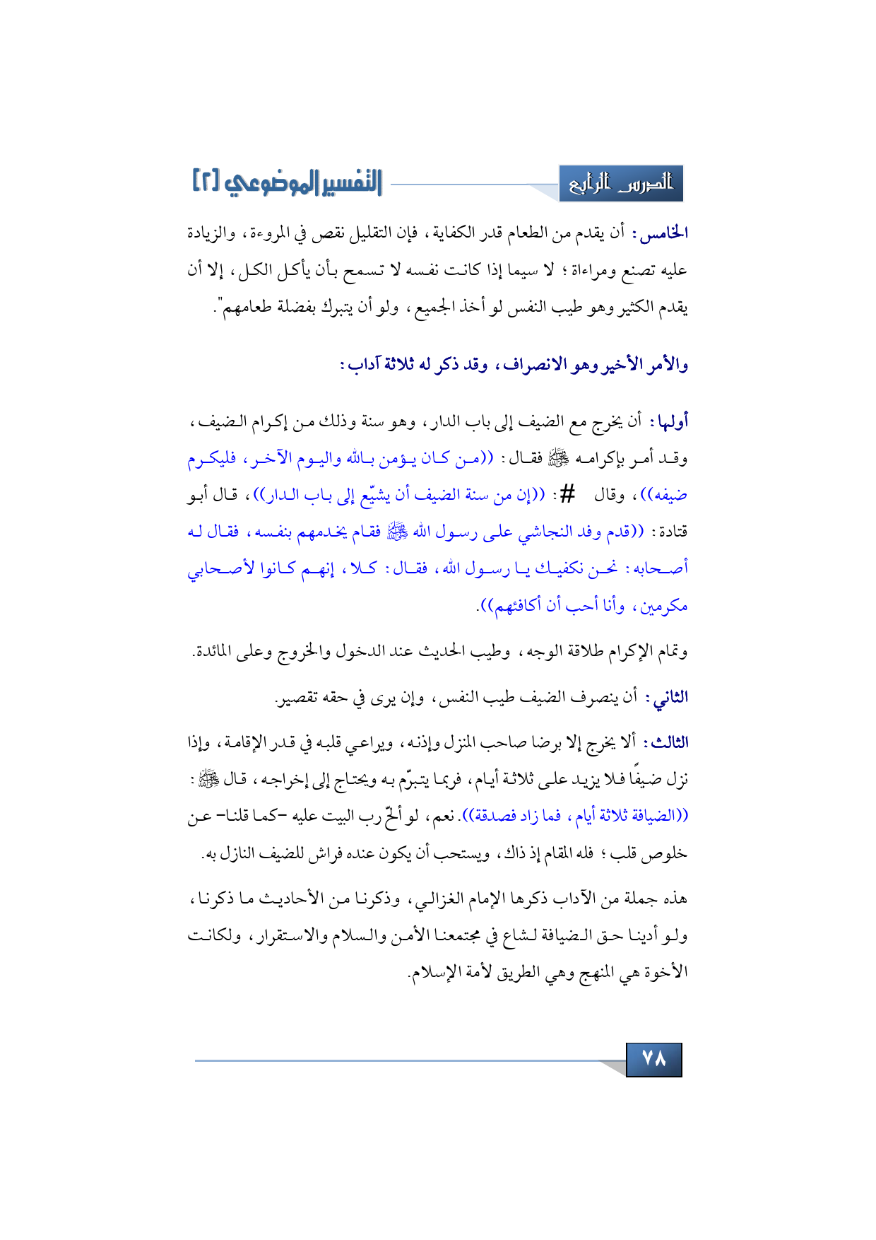 هذه جملة من الآداب ذكرها الإمام الغزالي، وذكرنا من الأحاديث ما ذكرنا، ولو أدينا حق الضيافة لشاع في مجتمعنا الأمن والسلام والاستقرار، ولكانت الأخوة هي المنهج وهي الطريق لأمة الإسلام.
