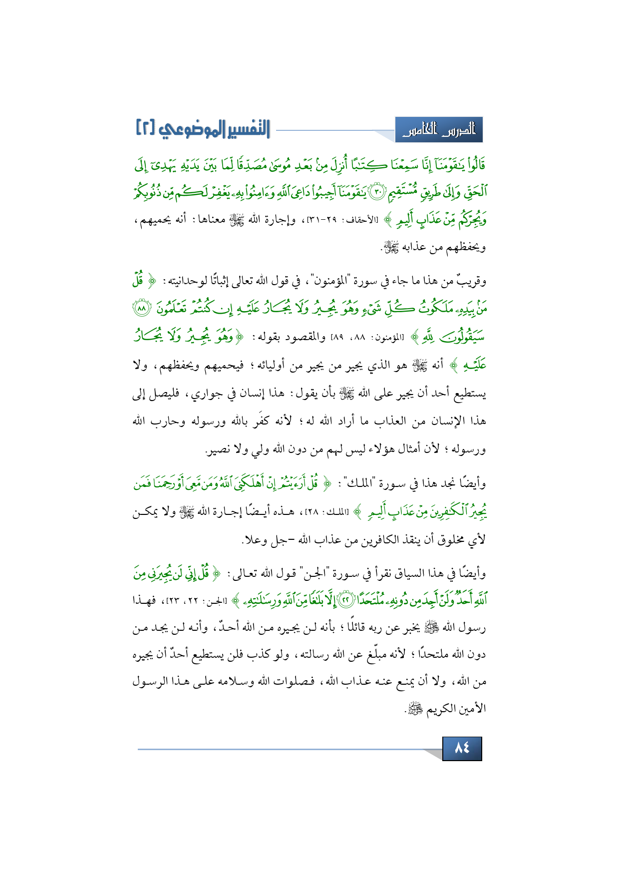 وقريبٌ من هذا ما جاء في سورة "المؤمنون" في قول الله تعالى إثباتًُا لوحدانيته: {قُلْ مَنْ بِيَدِهِ مَلَكُوتُ كُلِّ شَيْءٍ وَهُوَ يُجِيرُ وَلَا يُجَارُ عَلَيْهِ إِنْ كُنْتُمْ تَعْلَمُون َ * سَيَقُولُونَ لِلَّهِ} (المؤمنون: 88، 89) والمقصود بقوله: {وَهُوَ يُجِيرُ وَلاَ يُجَارُ عَلَيْهِ} أنه -سبحانه وتعالى- هو الذي يجير من يجيره من أوليائه؛ يحميهم ويحفظهم، ولا يستطيع أحد أن يجير على الله -سبحانه وتعالى- بأن يقول: هذا إنسان في جواري، فلا يصل إلى هذا الإنسان من العذاب ما أراد الله له؛ لأنه كفَر بالله ورسوله وحارب الله ورسوله؛ لأنه أمثال هؤلاء ليس لهم من دون الله ولي ولا نصير.