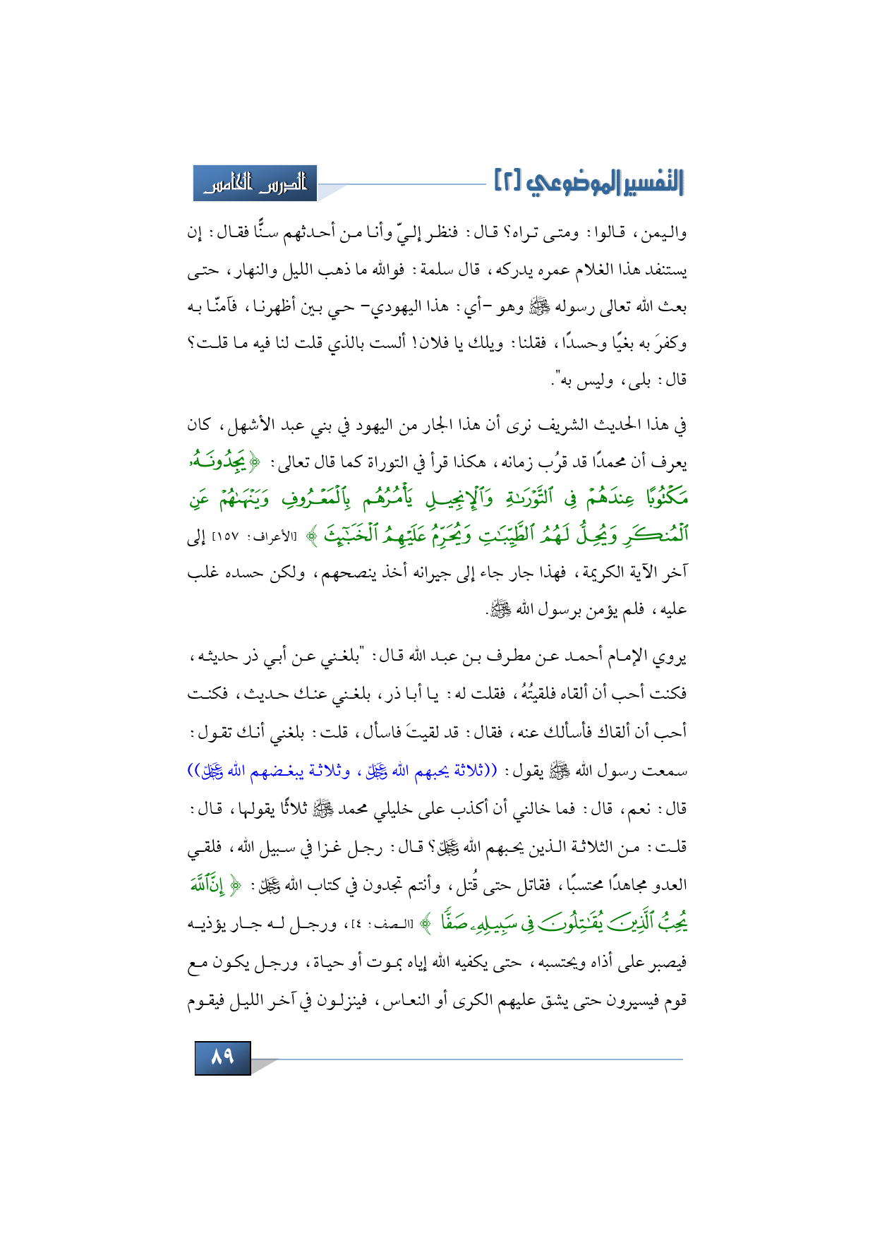 يروي الإمام أحمد عن مطرف بن عبد الله قال: "بلغني عن أبي ذر حديثه، فكنت أحب أن ألقاه فلقيته فقلت له: يا أبا ذر، بلغني عنك حديث فكنت أحب أن ألقاك فأسألك عنه، فقال: قد لقيت فاسأل، قلت: بلغني أنك تقول: سمعت رسول الله -صلى الله عليه وسلم- يقول: ((ثلاثة يحبهم الله عز وجل، وثلاثة يبغضهم الله عز وجل)) قال: نعم، قال: فما خالني أن أكذب على خليلي محمد -صلى الله عليه وسلم- ثلاث يقولها، قال: قلت: من الثلاثة الذين يحبهم الله عز وجل؟ قال: رجل غزا في سبيل الله، فلقي العدو مجاهدًا محتسبًا فقاتل حتى قتل وأنتم تجدون في كتاب الله -عز وجل-: {إِنَّ اللَّهَ يُحِبُّ الَّذِينَ يُقَاتِلُونَ فِي سَبِيلِهِ صَفًّا} (الصف: 4)، ورجل له جار يؤذيه فيصبر على أذاه ويحتسبه حتى يكفيه الله إياه بموت أو حياة، ورجل يكون مع قوم فيسيرون حتى يشق عليهم الكرى أو النعاس، فينزلون في آخر الليل فيقوم