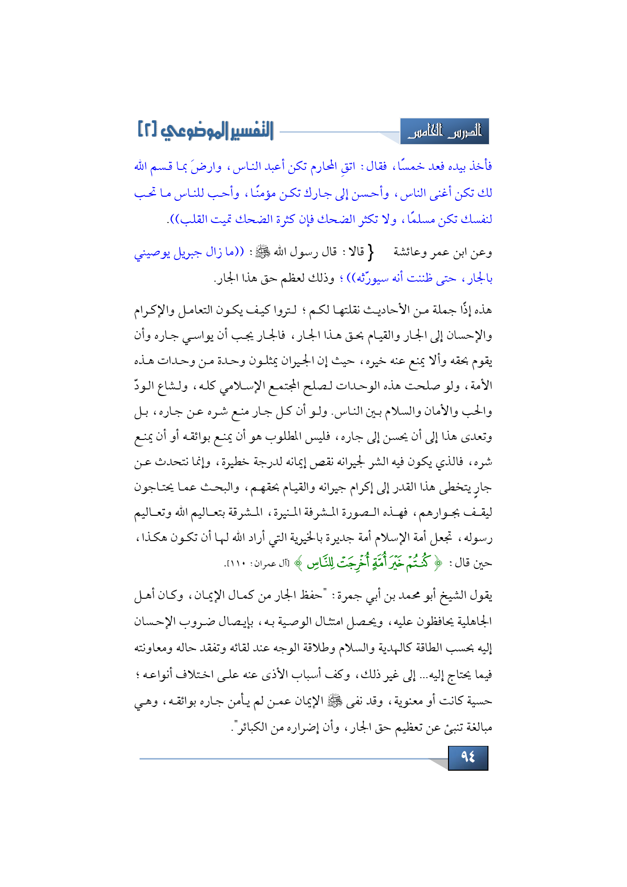 هذه إذًا جملة من الأحاديث نقلتها لكم لتروا كيف يكون التعامل والإكرام والإحسان إلى الجار والقيام بحق هذا الجار؛ في أن الجار يجب أن يواسي جاره، وأن يقوم بحقه وألا يمنع عنه خيره، فإذا كان هذا بين الجيران فإن الجيران تمثّل وحدة من وحدات هذه الأمة، ولو صلحت هذه الوحدات لصلح المجتمع الإسلامي كله، ولشاع الودّ والحب والأمان والسلام بين الناس، ولو أن كل جار منع شره عن جاره! بل تعدى هذا إلى أن يحسن إلى جاره، فليس المطلوب هو أن يمنع بوائقه، أو أن يمنع شره، فالذي يكون فيه الشر لجيرانه إنما نقص إيمانه لدرجة خطيرة، وإنما نتحدث عن جارٍ يتخطى هذا القدر إلى إكرام جيرانه والقيام بحقهم والبحث عما يحتاجون ليقف بجوارهم، فهذه الصورة المشرفة المنيرة المشرقة بتعاليم الله وتعاليم رسوله تجعل أمة الإسلام أمة جديرة بالخيرية التي أراد الله لها أن تكون هكذا حين قال: {كُنتُمْ خَيْرَ أُمَّةٍ أُخْرِجَتْ لِلنَّاسِ} (آل عمران: 110).