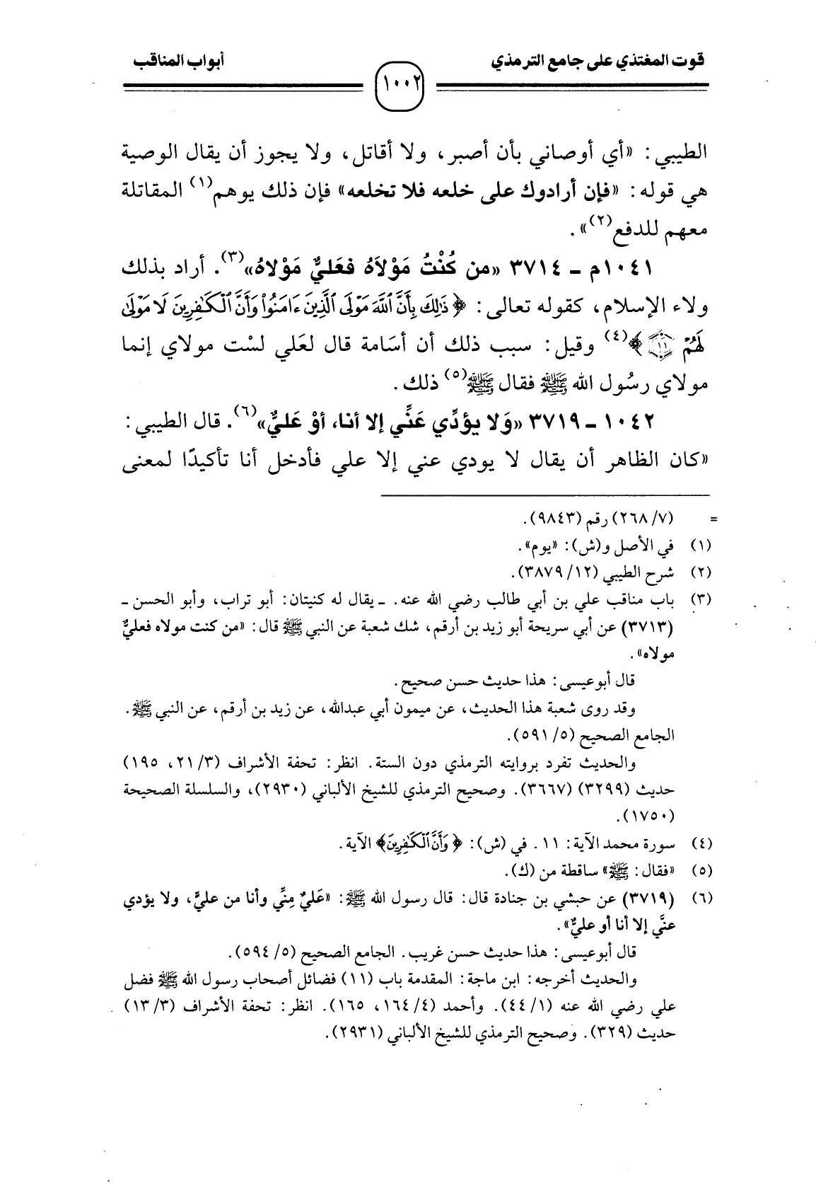 1041 م - 3714 "من كُنْتُ مَوْلاَهُ فعَليٌّ مَوْلاهُ". أراد بذلك ولاء الإسلام، كقوله تعالى: {ذَلِكَ بِأَنَّ اللَّهَ مَوْلَى الَّذِينَ آَمَنُوا وَأَنَّ الْكَافِرِينَ لَا مَوْلَى لَهُمْ (11) } وقيل: سبب ذلك أن أسَامة قال لعَلي لسْت مولاي إنما مولاي رسُول الله - صَلَّى اللَّهُ عَلَيْهِ وَسَلَّمَ - فقال - صَلَّى اللَّهُ عَلَيْهِ وَسَلَّمَ - ذلك.