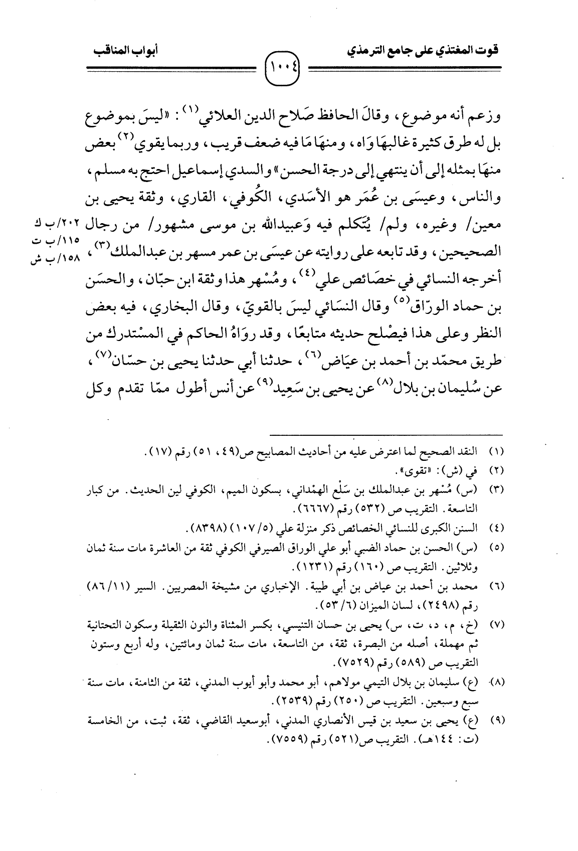 وزعم أنه موضوع، وقالَ الحافظ صَلاح الدين العلائي: " ليسَ بموضوع بل له طرق كثيرة غالبهَا وَاه، ومنهَا مَا فيه ضعف قريب، وربما يقوي بعض منهَا بمثله إلى أن ينتهي إلى درجة الحسن " والسدي إسماعيل احتج به مسلم، والناس، وعيسَى بن عُمَر هو الأسَدي، الكُوفي، القاري، وثقة يحيى بن معين وغيره، ولم يُتَكلم فيه وَعبيد الله بن موسى مشهور من رجال الصحيحين، وقد تابعه على روايته عن عيسَى بن عمر مسهر بن عبد الملك، أخرجه النسائي في خصَائص علي، ومُسْهر هذا وثقة ابن حبّان، والحسَن بن حماد الورّاق وقال النسَائي ليسَ بالقويّ، وقال البخاري، فيه بعض النظر وعلى هذا فيصْلح حديثه متابعًا، وقد روَاهُ الحاكم في المسْتدرك من ْطريق محمّد بن أحمد بن عيَاض، حدثنا أبي حدثنا يحيى بن حسّان، عن سُليمان بن بلال عن يحيى بن سعِيد عن أنس أطول ممّا تقدم وكل
