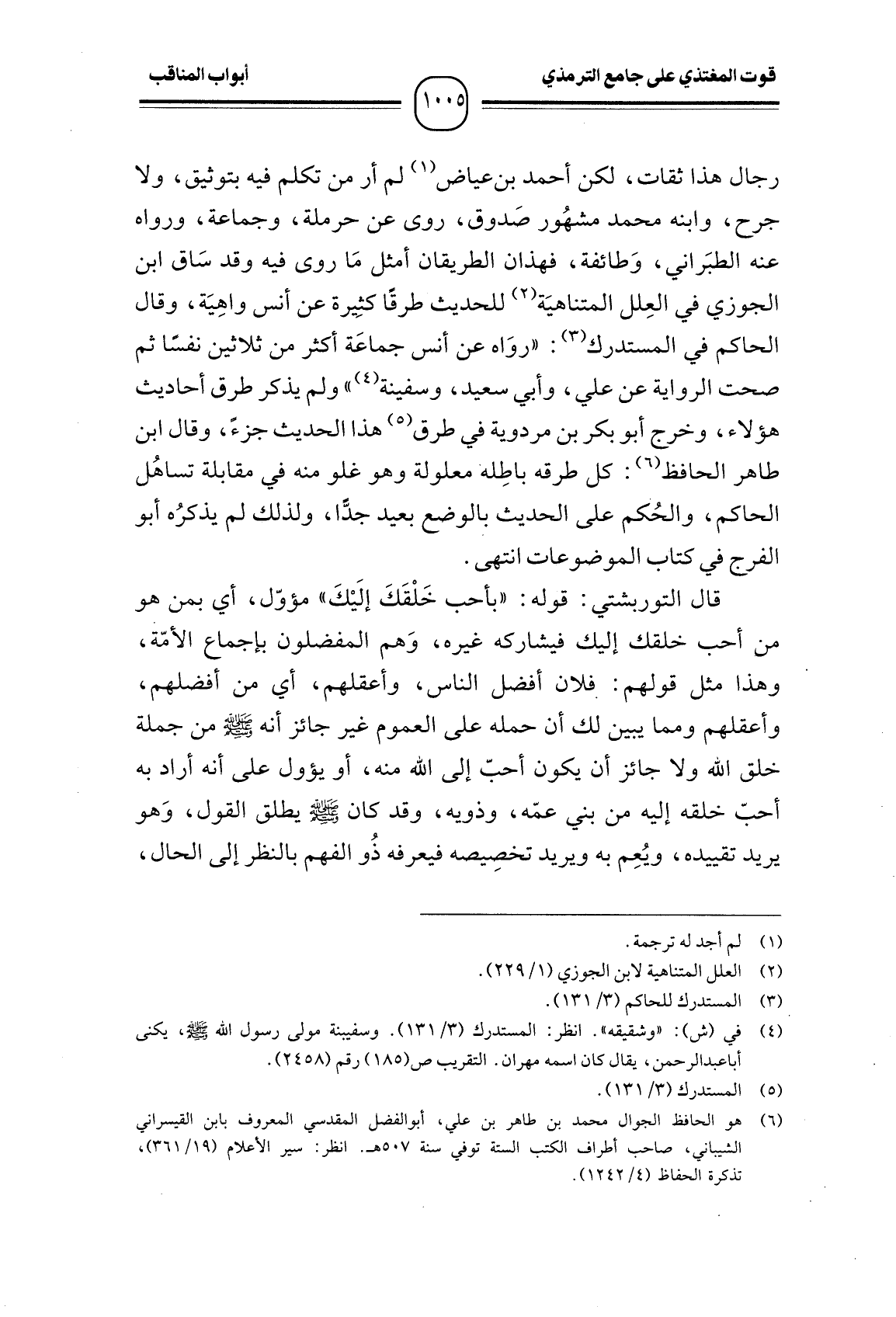 رجال هذا ثقات، لكن أحمد بن عياض لم أر من تكلم فيه بتوثيق، ولا جرح، وابنه محمد مشهُور صَدوق، روى عن حرملة، وجماعة، ورواه عنه الطبَراني، وَطائفة، فهذان الطريقان أمثل مَا روى فيه وقد سَاق ابن الجوزي في العِلل المتناهيَة للحديث طرقًا كثيرة عن أنس واهِيَة، وقال الحاكم في المستدرك: " روَاه عن أنس جماعَة أكثر من ثلاثين نفسًا ثم صحت الرواية عن علي، وأبي سعيد، وسفينة " ولم يذكر طرق أحاديث هؤلاء، وخرج أبو بكر بن مردوية في طرق هذا الحديث جزءً، وقال ابن طاهر الحافظ: كل طرقه باطِله معلولة وهو غلو منه في مقابلة تساهُل الحاكم، والحُكم على الحديث بالوضع بعيد جدًّا، ولذلك لم يذكرُه أبو الفرج في كتاب الموضوعات انتهى.