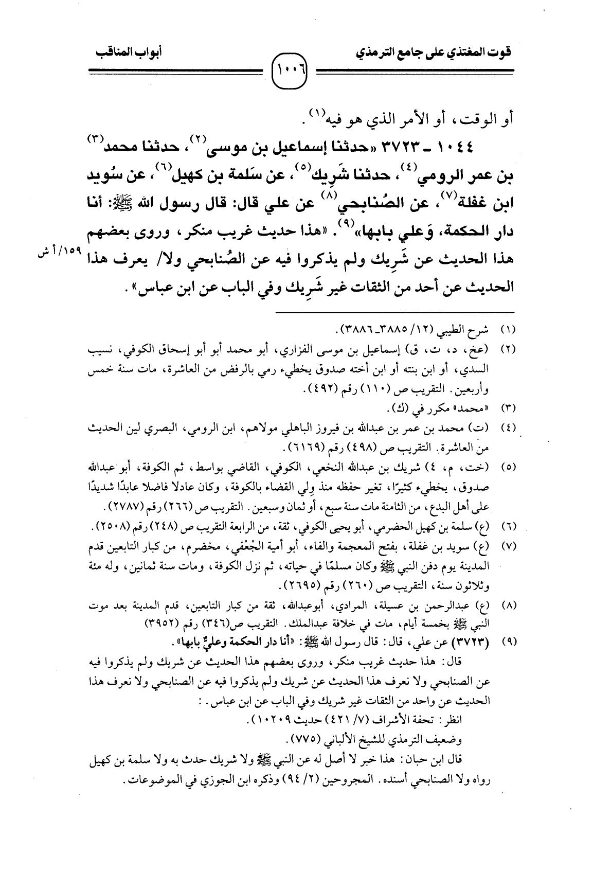 1044 -[3723] "حدثنا إسماعيل بن موسى، حدثنا محمد بن عمر الرومي، حدثنا شَرِيك، عن سَلمة بن كهيل، عن سُويد ابن غفلة، عن الصُنابحي عن علي قال: قال رسول الله - صَلَّى اللَّهُ عَلَيْهِ وَسَلَّمَ -: أنا دار الحكمة، وَعلي بابها". "هذا حديث غريب منكر، وروى بعضهم هذا الحديث عن شَرِيك ولم يذكروا فيه عن الصُنابحي ولا يعرف هذا الحديث عن أحد من الثقات غير شَرِيك وفي الباب عن ابن عباس".