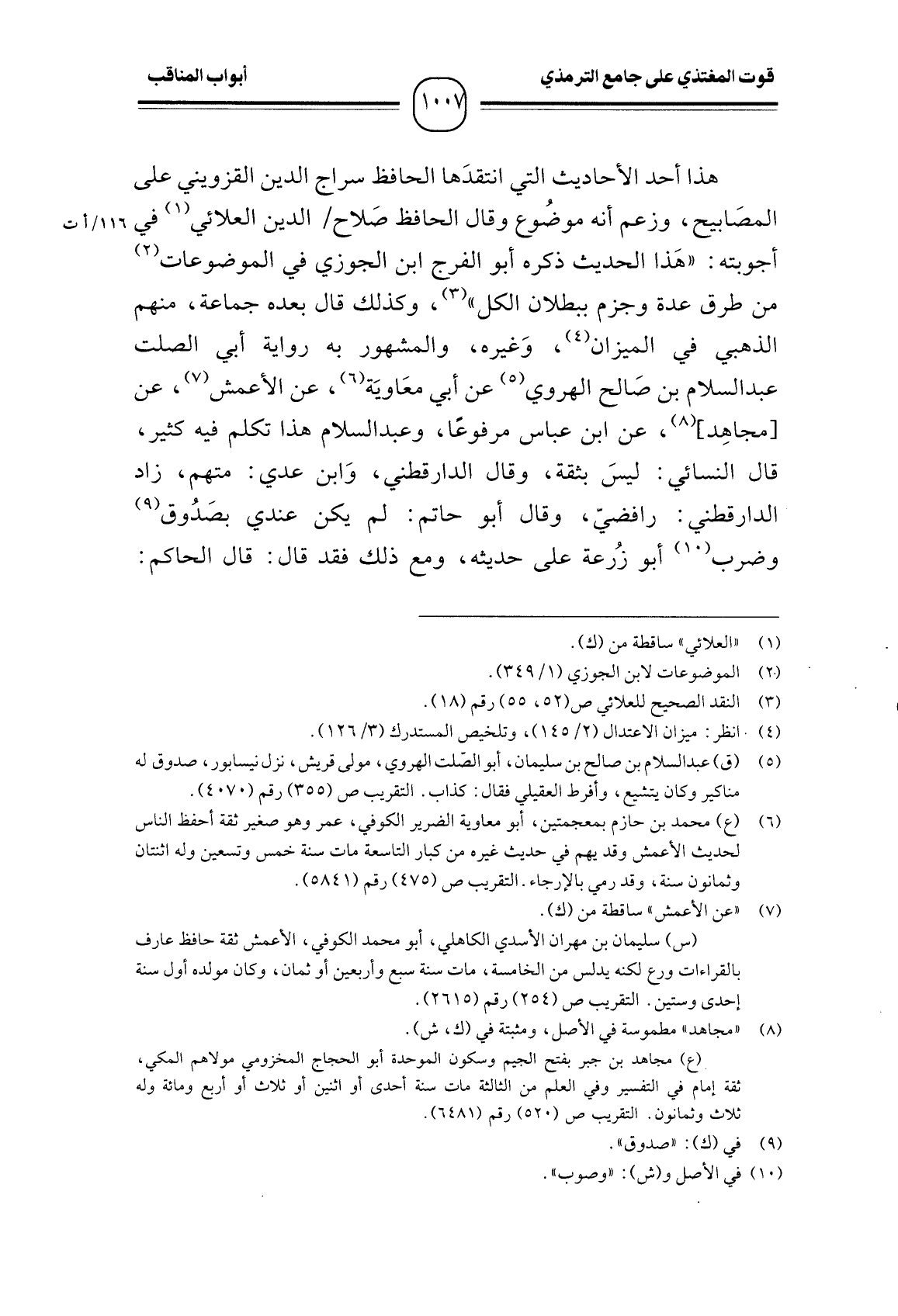 هذا أحد الأحاديث التي انتقدَها الحافظ سراج الدين القزويني على المصَابيح، وزعم أنه موضُوع وقال الحافظ صَلاح الدين العلائي في أجوبته: " هَذا الحديث ذكره أبو الفرج ابن الجوزي في الموضوعات من طرق عدة وجزم ببطلان الكل "، وكذلك قال بعده جماعة، منهم الذهبي في الميزان، وَغيره، والمشهور به رواية أبي الصلت عبد السلام بن صَالح الهروي عن أبي معَاويَة، عن الأعمش، عن [مجاهِد] ، عن ابن عباس مرفوعًا، وعبد السلام هذا تكلم فيه كثير، قال النسائي: ليسَ بثقة، وقال الدارقطني، وَابن عدي: متهم، زاد الدارقطني: رافضيّ، وقال أبو حاتم: لم يكن عندي بصَدُوق وضرب أبو زُرعة على حديثه، ومع ذلك فقد قال: قال الحاكم: