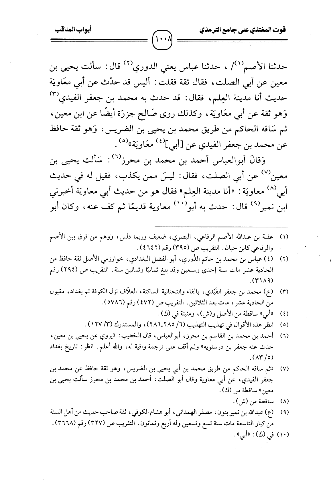 حدثنا الأصم، حدثنا عباس يعني الدوري قال: سألت يحيى بن معين عن أبي الصلت، فقال ثقة فقلت: أليس قد حدّث عن أبي معَاويَة حديث أنا مدينة العِلم، فقال: قد حدث به محمد بن جعفر الفيدي وَهو ثقة عن أبي معَاويَة، وكذلك روى صَالح جزرَة أيضًا عن ابن معين، ثم سَاقه الحاكم من طريق محمد بن يحيى بن الضريس، وَهو ثقة حافظ عن محمد بن جعفر الفيدي عن [أبي] معَاويَة".