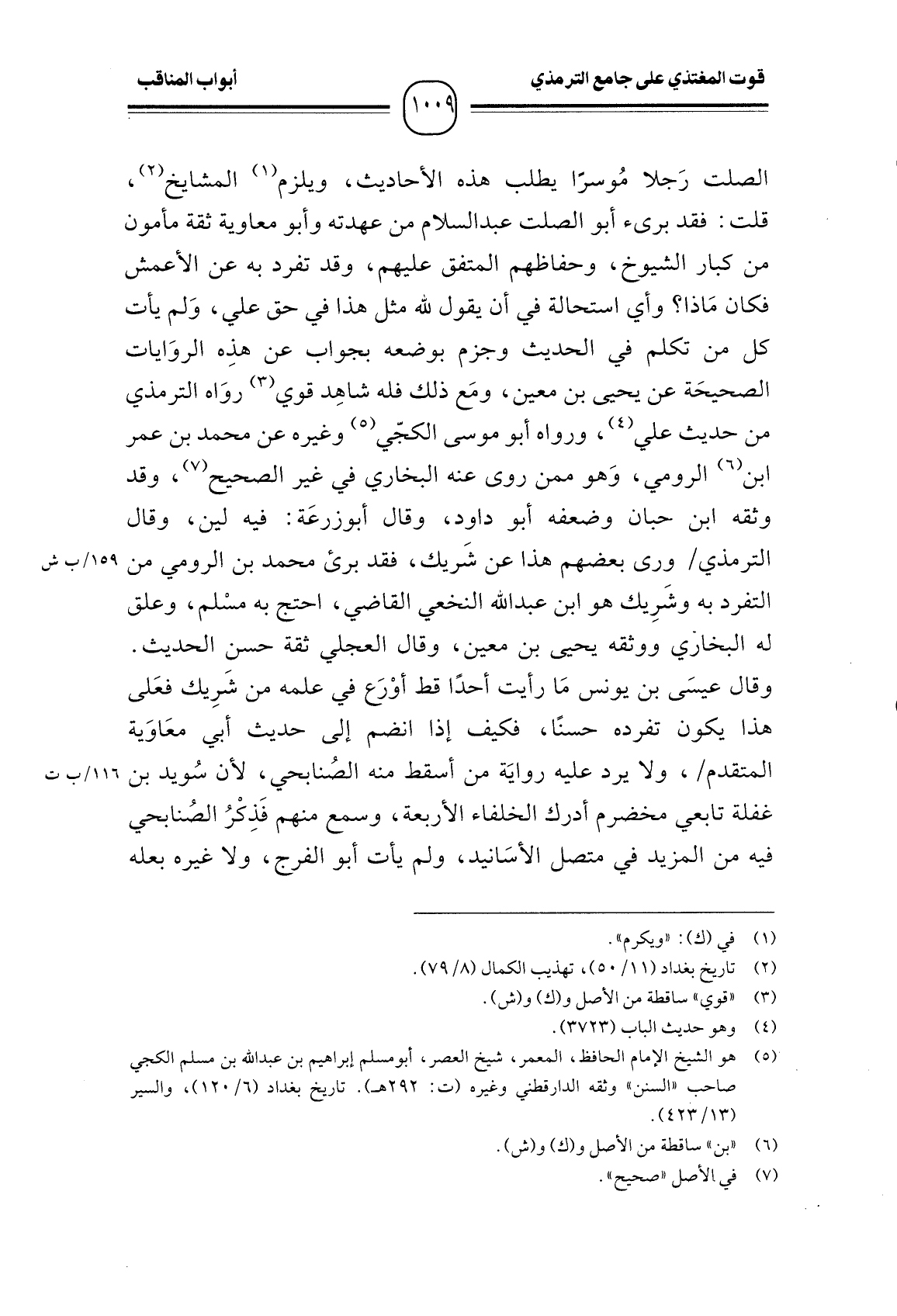 الصلت رَجلا مُوسرًا يطلب هذه الأحاديث، ويلزم المشايخ، قلت: فقد برىء أبو الصلت عبد السلام من عهدته وأبو معاوية ثقة مأمون من كبار الشيوخ، وحفاظهم المتفق عليهم، وقد تفرد به عن الأعمش فكان مَاذا؟ وأي استحالة في أن يقول لله مثل هذا في حق علي، وَلم يأت كل من تكلم في الحديث وجزم بوضعه بجواب عن هذِه الروَايات الصحيحَة عن يحيى بن معين، ومَع ذلك فله شاهِد قوي روَاه الترمذي من حديث علي، ورواه أبو موسى الكجّي وغيره عن محمد بن عمر ابن الرومي، وَهو ممن روى عنه البخاري في غير الصحيح، وقد وثقه ابن حبان وضعفه أبو داود، وقال أبو زرعَة: فيه لين، وقال الترمذي ورى بعضهم هذا عن شَريك، فقد برئ محمد بن الرومي من التفرد به وشَرِيك هو ابن عبد الله النخعي القاضي، احتج به مسْلم، وعلق له البخاري ووثقه يحيى بن معين، وقال العجلي ثقة حسن الحديث.