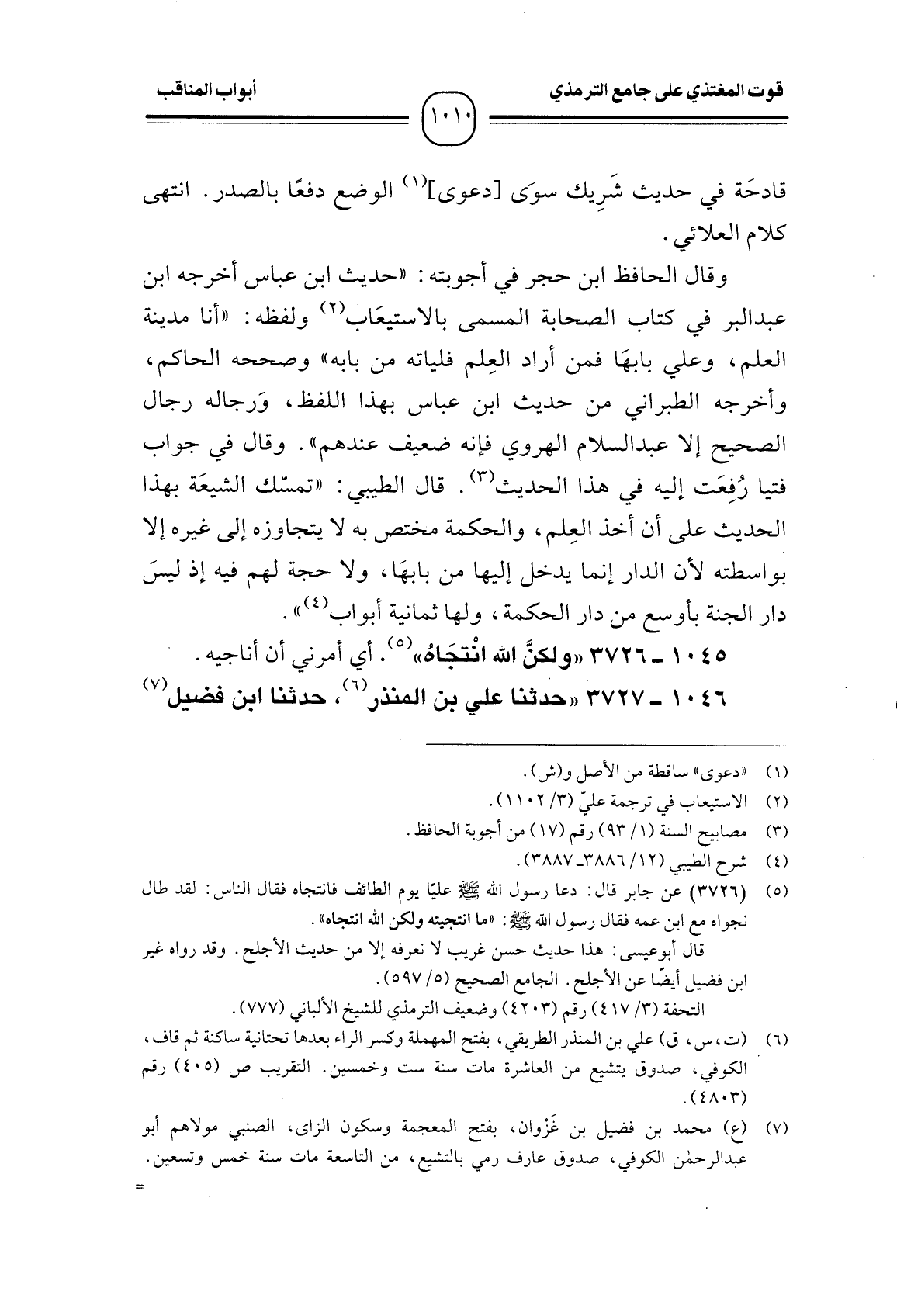 وقال الحافظ ابن حجر في أجوبته: " حديث ابن عباس أخرجه ابن عبد البر في كتاب الصحابة المسمى بالاستيعَاب ولفظه: " أنا مدينة العلم، وعلي بابهَا فمن أراد العِلم فلياته من بابه " وصححه الحاكم، وأخرجه الطبراني من حديث ابن عباس بهذا اللفظ، وَرجاله رجال الصحيح إلا عبد السلام الهروي فإنه ضعيف عندهم ". وقال في جواب فتيا رُفِعَت إليه في هذا الحديث. قال الطيبي: " تمسّك الشيعَة بهذا الحديث على أن أخذ العِلم، والحكمة مختص به لا يتجاوزه إلى غيره إلا بواسطته لأن الدار إنما يدخل إليها من بابهَا، ولا حجة لهم فيه إذ ليسَ دار الجنة بأوسع من دار الحكمة، ولها ثمانية أبواب ".