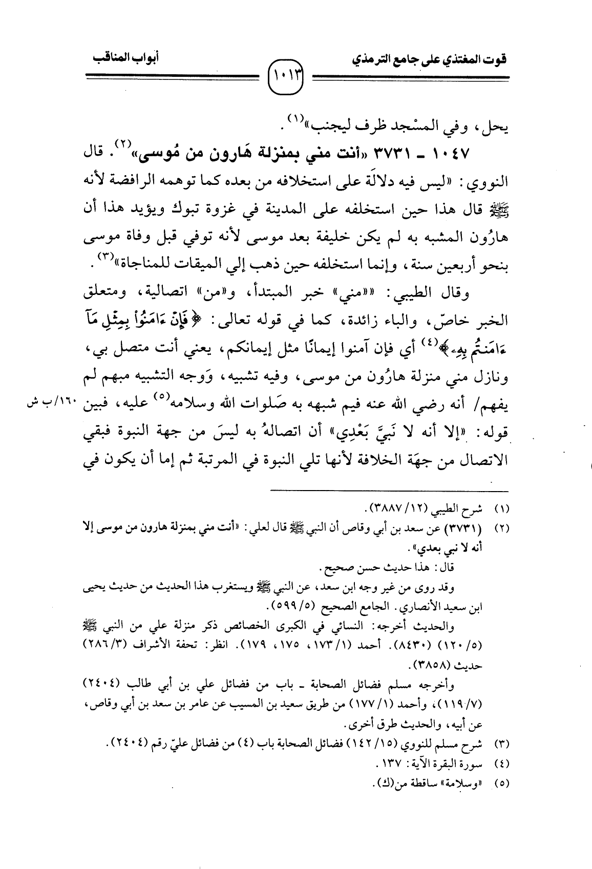 1047 -[3731] "أنت مني بمنزلة هَارون من مُوسى". قال النووي: " ليس فيه دلالَة على استخلافه من بعده كما توهمه الرافضة لأنه - صَلَّى اللَّهُ عَلَيْهِ وَسَلَّمَ - قال هذا حين استخلفه على المدينة في غزوة تبوك ويؤيد هذا أن هارُون المشبه به لم يكن خليفة بعد موسى لأنه توفي قبل وفاة موسى بنحو أربعين سنة، وإنما استخلفه حين ذهب إلي الميقات للمناجاة".