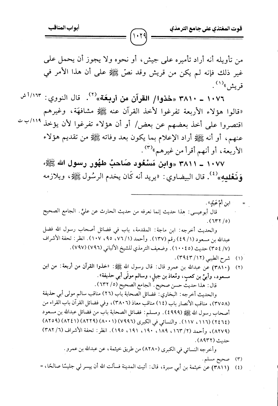 1077 -[3811] "وابن مَسْعُود صَاحبُ طهُور رسول الله - صَلَّى اللَّهُ عَلَيْهِ وَسَلَّمَ -، وَنَعْليهِ". قال البيضاوي: "يريد أنه كَان يخدم الرسُول - صَلَّى اللَّهُ عَلَيْهِ وَسَلَّمَ -، ويلازمه