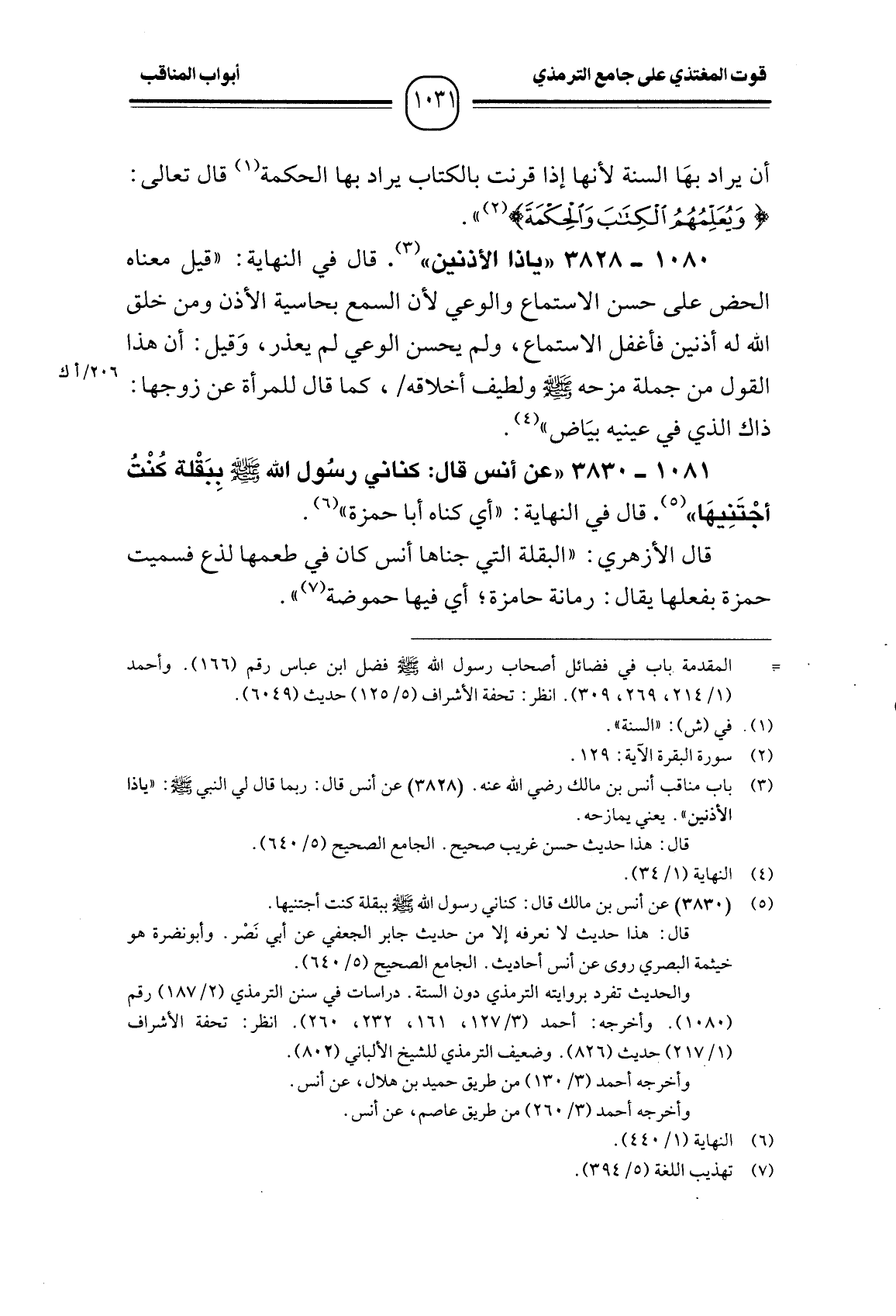 1081 -[3830] "عن أنس قال: كناني رسُول الله - صَلَّى اللَّهُ عَلَيْهِ وَسَلَّمَ - بِبَقْلة كُنْتُ أجْتَنِيهَا". قال في النهاية: " أي كناه أبا حمزة".