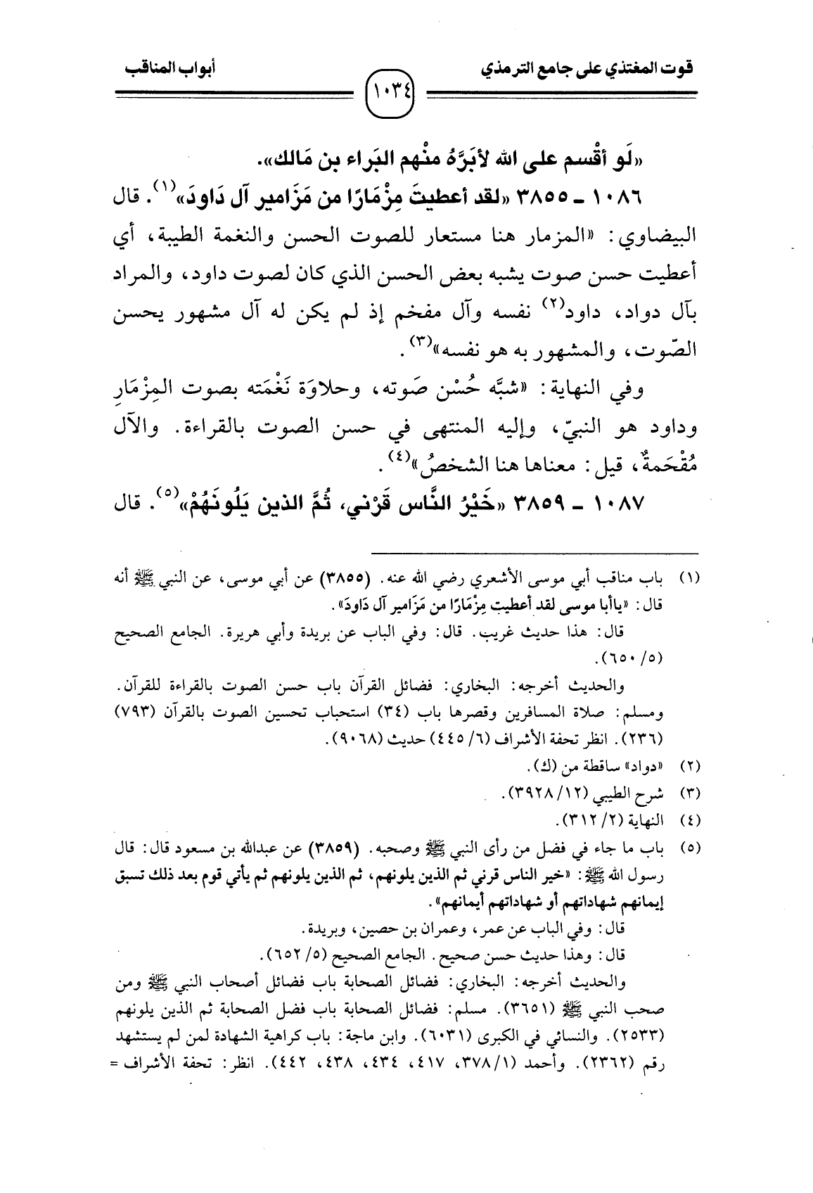 1086 -[3855] "لقد أعطيتَ مِزْمَارًا من مَزَامير آل دَاودَ". قال البيضاوي: " المزمار هنا مستعار للصوت الحسن والنغمة الطيبة، أي أعطيت حسن صوت يشبه بعض الحسن الذي كان لصوت داود، والمراد بآل دواد، داود نفسه وآل مفخم إذ لم يكن له آل مشهور يحسن الصّوت، والمشهور به هو نفسه".