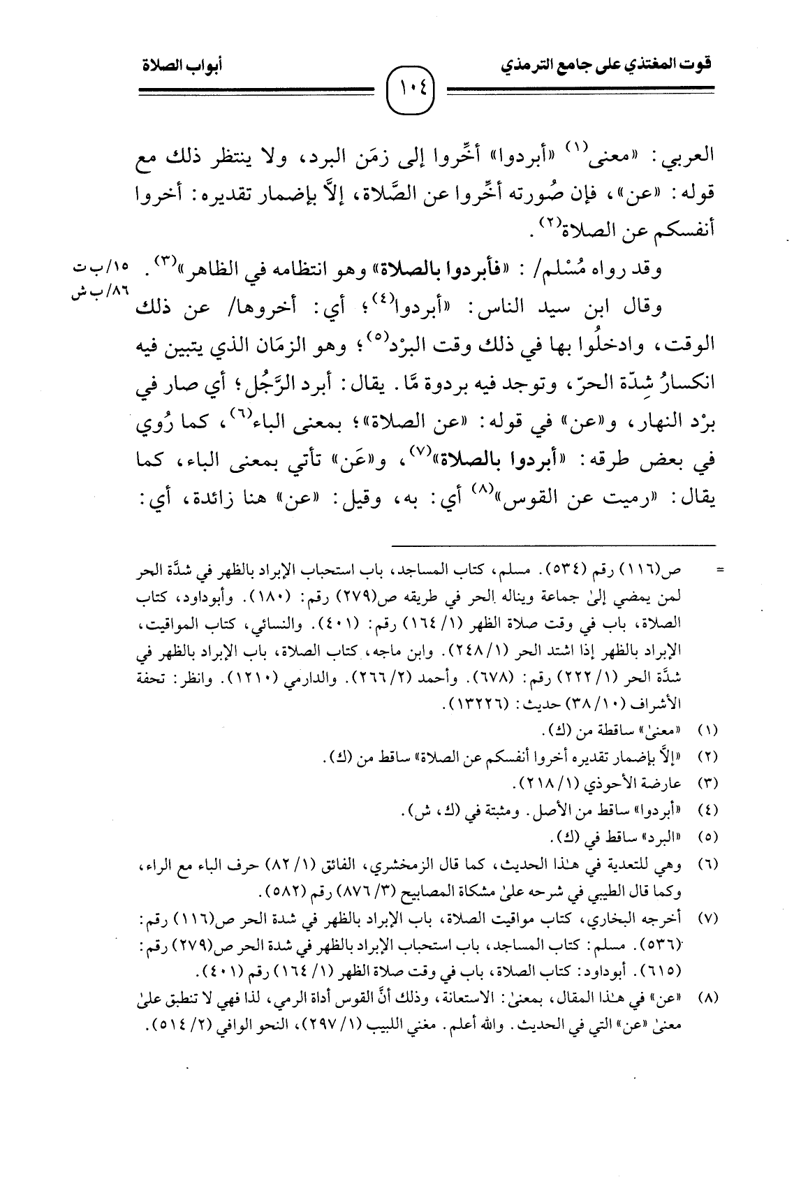 = ص (116) رقم (534) . مسلم، كتاب المساجد، باب استحباب الإبراد بالظهر في شدَّة الحر لمن يمضي إلى جماعة ويناله الحر في طريقه ص (279) رقم: (180) . وأبو داود، كتاب الصلاة، باب في وقت صلاة الظهر (1/164) رقم: (401) . والنسائي، كتاب المواقيت، الإبراد بالظهر إذا اشتد الحر (1/248) . وابن ماجه، كتاب الصلاة، باب الإبراد بالظهر في شدَّة الحر (1/222) رقم: (678) . وأحمد (2/266) . والدارمي (1210) . وانظر: تحفة الأشراف (10/38) حديث: (13226) .