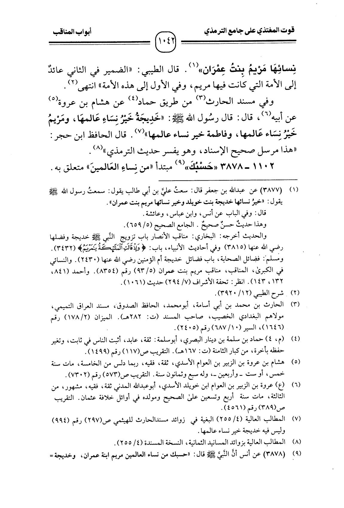 نِسائِهَا مَريمُ بِنتُ عِمْرَان". قال الطيبي: "الضمير في الثاني عائد إلى الأمة التي كانت فيها مريم، وفي الأول إلى هذه الأمة" انتهى.