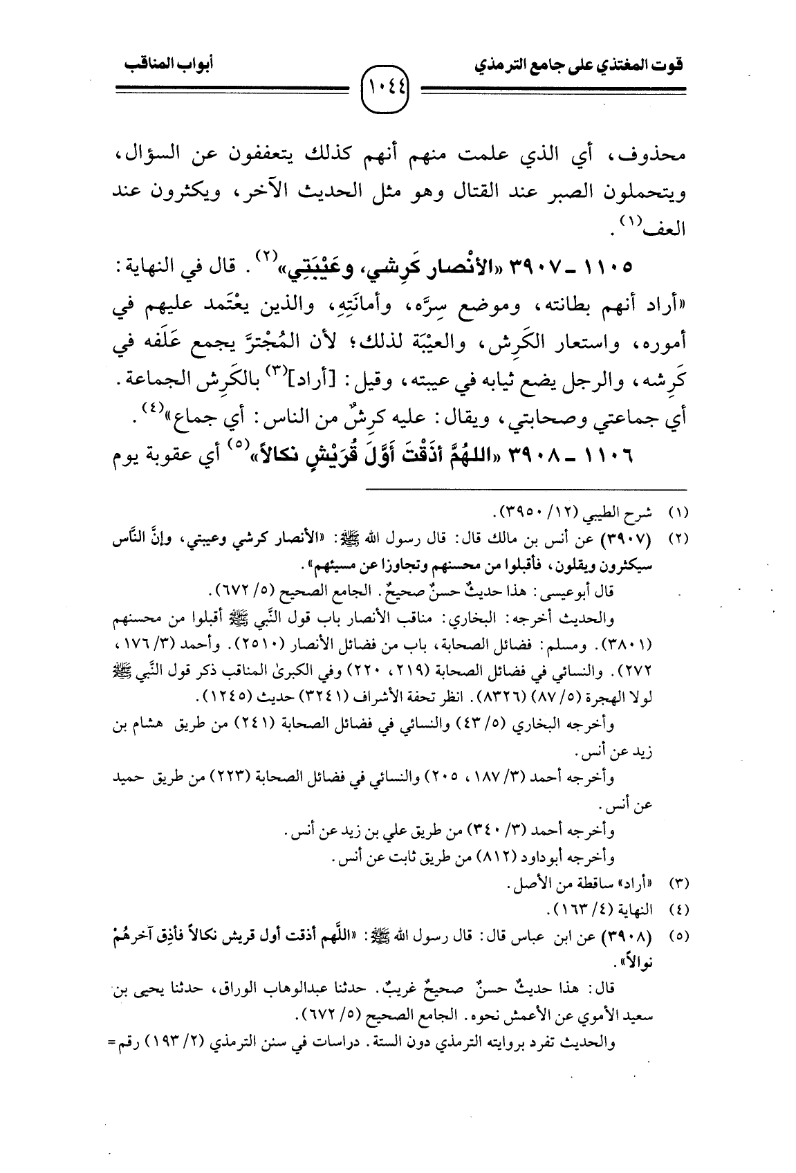 1105 -[3907] "الأنصار كَرِشي، وعَيْبَتِي". قال في النهاية: "أراد أنهم بطانته، وموضع سِرَّه، وأمانَتِهِ، والذين يعْتَمد عليهم في أموره، واستعار الكَرِش، والعيْبَة لذلك؛ لأن المُجْترَّ يجمع عَلَفه في كَرِشه، والرجل يضع ثيابه في عيبته، وقيل: [أراد] بالكَرِش الجماعة. أي جماعتي وصحابتي، ويقال: عليه كرِشٌ من الناس: أي جماع".