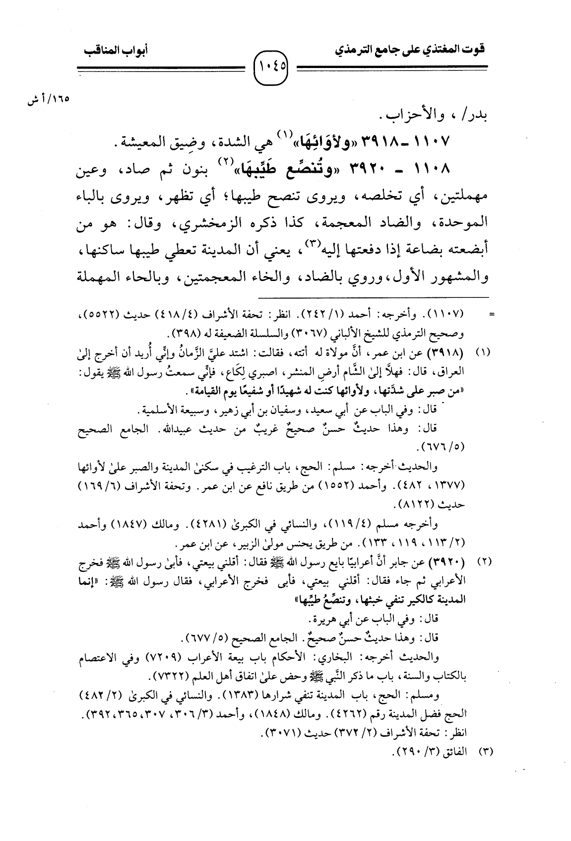 1108 -[3920] "وتُنصِّع طَيِّبهَا" بنون ثم صاد، وعين مهملتين، أي تخلصه، ويروى تنصح طيبها؛ أي تظهر، ويروى بالباء الموحدة، والضاد المعجمة، كذا ذكره الزمخشري، وقال: هو من أبضعته بضاعة إذا دفعتها إليه، يعني أن المدينة تعطي طيبها ساكنها، والمشهور الأول، وروي بالضاد، والخاء المعجمتين، وبالحاء المهملة