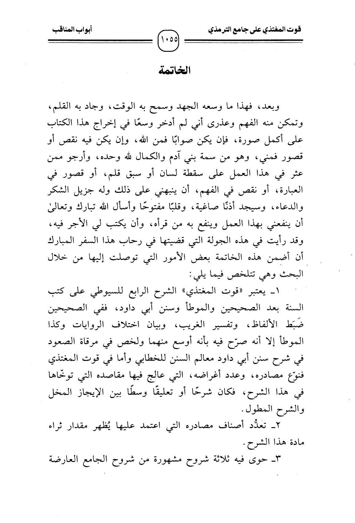 وبعد، فهذا ما وسعه الجهد وسمح به الوقت، وجاد به القلم، وتمكن منه الفهم وعذرى أني لم أدخر وسعًا في إخراج هذا الكتاب على أكمل صورة، فإن يكن صوابًا فمن الله، وإن يكن فيه نقص أو قصور فمني، وهو من سمة بني آدم والكمال لله وحده، وأرجو ممن عثر في هذا العمل على سقطة لسان أو سبق قلم، أو قصور في العبارة، أو نقص في الفهم، أن ينبهني على ذلك وله جزيل الشكر والدعاء، وسيجد أذنًا صاغية، وقلبًا مفتوحًا وأسأل الله تبارك وتعالى أن ينفعني بهذا العمل وينفع به من قرأه، وأن يكتب لي الأجر فيه، وقد رأيت في هذه الجولة التي قضيتها في رحاب هذا السفر المبارك أن أضمن هذه الخاتمة بعض الأمور التي توصلت إليها من خلال البحث وهي تتلخص فيما يلي: