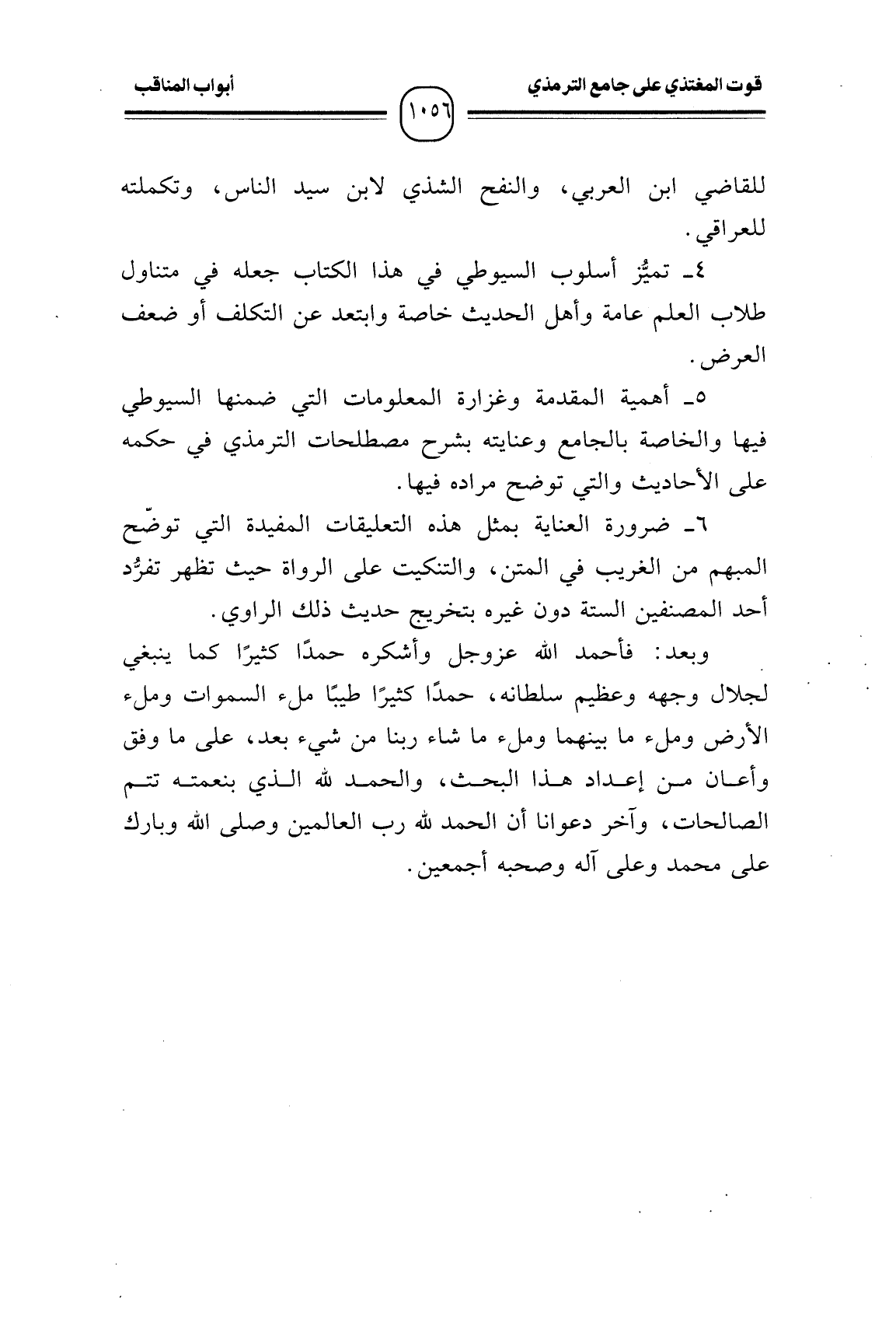 5- أهمية المقدمة وغزارة المعلومات التي ضمنها السيوطي فيها والخاصة بالجامع وعنايته بشرح مصطلحات الترمذي في حكمه على الأحاديث والتي توضح مراده فيها.