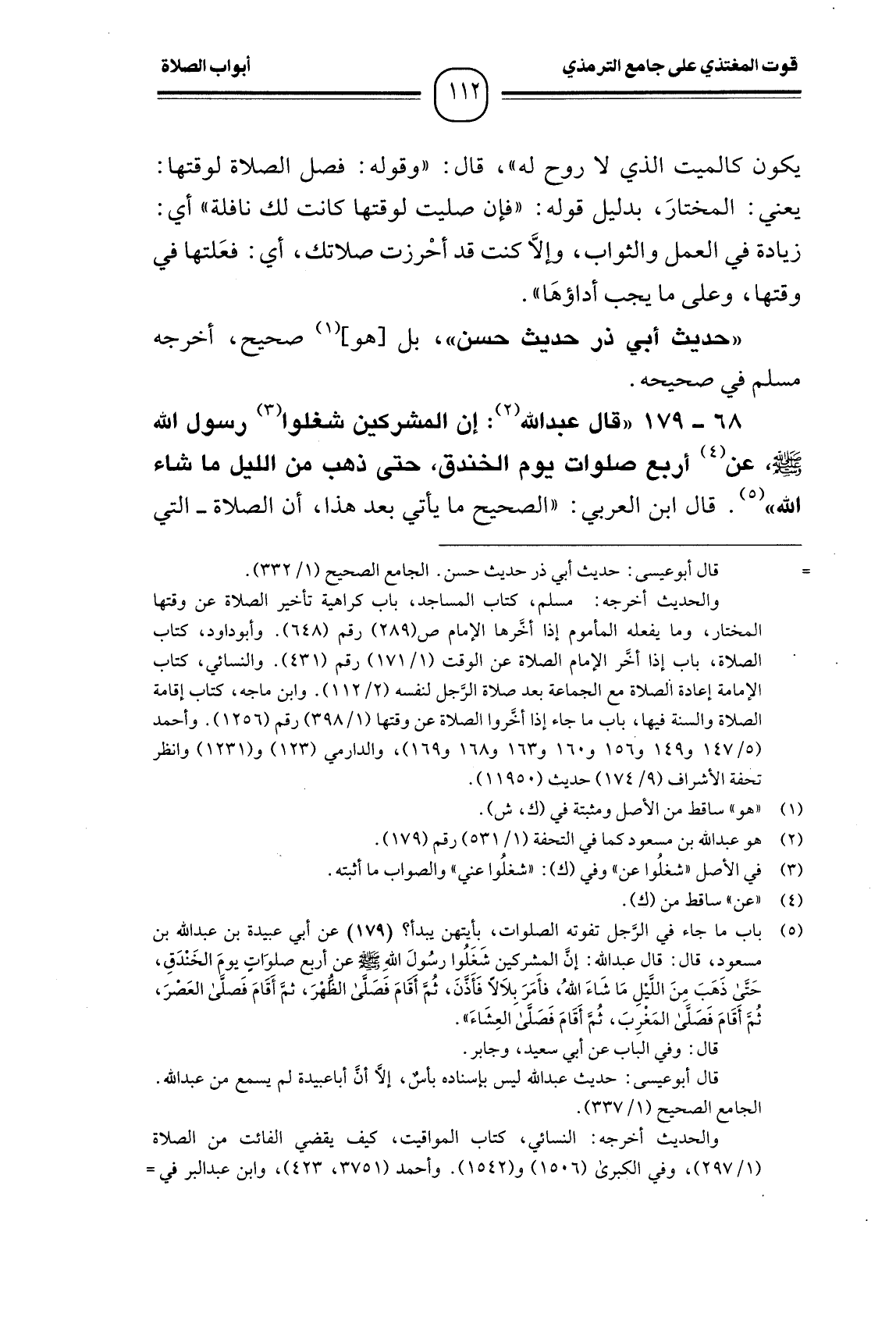 (¬4) باب ما جاء في الرَّجل تفوته الصلوات، بأيتهن يبدأ؟ (179) عن أبي عبيدة بن عبد الله بن مسعود، قال: قال عبد الله: إنَّ المشركين شَغَلُوا رسُولَ اللهِ - صَلَّى اللَّهُ عَلَيْهِ وَسَلَّمَ - عن أربع صلوَاتٍ يومَ الخَنْدَقِ، حَتَّى ذَهبَ مِنَ اللَّيْلِ مَا شَاءَ اللهُ، فأَمَرَ بلاَلاً فَأذَّنَ، ثُمَّ أَقامَ فَصلَّى الظُّهْرَ، ثمَّ أَقَامَ فَصلَّى العَصْرَ، ثُمَّ أَقَامَ فَصّلَّى المَغْرِبَ، ثُمَّ أَقَامَ فَصَلَّى العِشَاءَ".