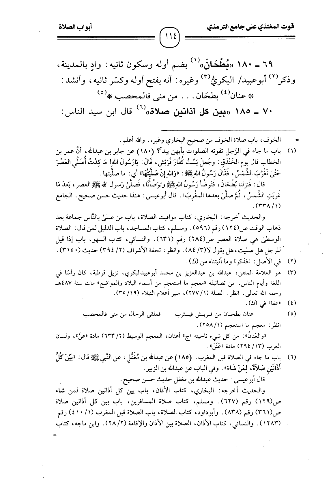 69 -[180] "بُطْحَانَ" (¬1) بضم أوله وسكون ثانيه: وادٍ بالمدينة، وذكر (¬2) أبو عبيد البكريُّ (¬3) وغيره: أنه بفتح أوله وكسْر ثانيه، وأنشد: