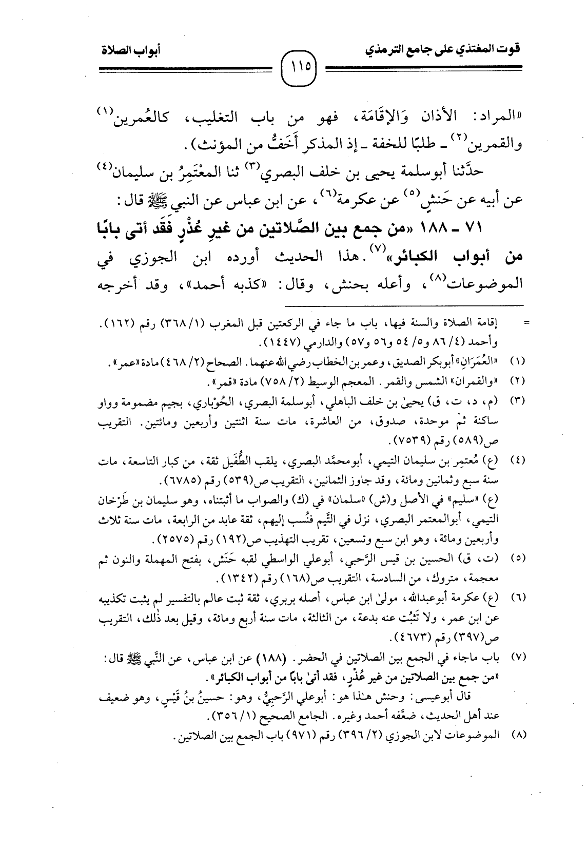 (¬1) باب ما جاء في الجمع بين الصلاتين في الحضر. (188) عن ابن عباس، عن النَّبي - صَلَّى اللَّهُ عَلَيْهِ وَسَلَّمَ - قال: " من جمع بين الصلاتين من غير عُذْرٍ، فقد أتى بابًا من أبواب الكبائر ".