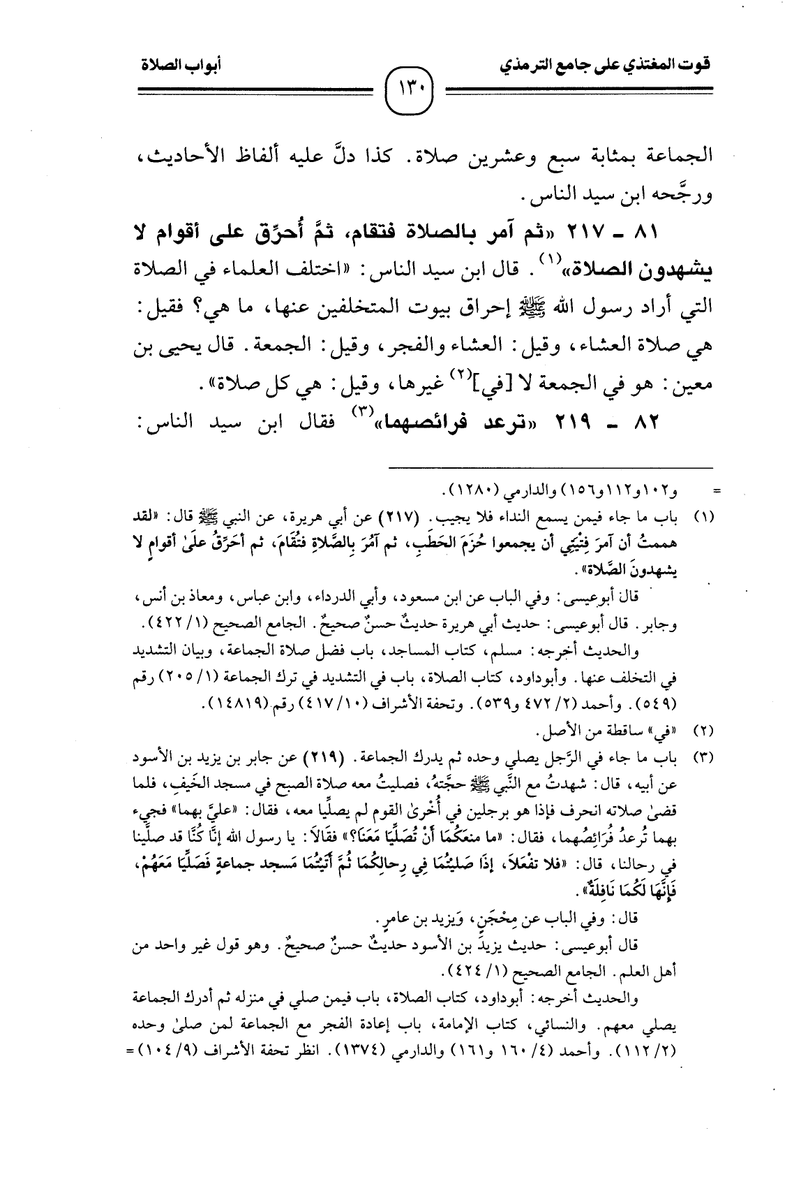 (¬1) باب ما جاء فيمن يسمع النداء فلا يجيب. (217) عن أبي هريرة، عن النبي - صَلَّى اللَّهُ عَلَيْهِ وَسَلَّمَ - قال: " لقد هممتُ أن آمرَ فِتيتيَ أن يجمعوا حُزَمَ الحَطَبِ، ثم آمُرَ بِالصَّلاةِ فتُقَامَ، ثم أحَرِّقُ علَى أقوامٍ لا يشهدونَ الصَّلاة ".