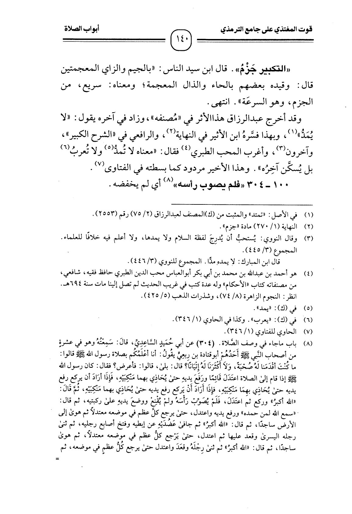 (¬1) باب ما جاء في وصف الصَّلاة. (304) عن أبي حُمَيدٍ السَّاعِدِيِّ، قالَ: سَمِعْتُهُ وهو في عشرةٍ من أصحاب النَّبي - صَلَّى اللَّهُ عَلَيْهِ وَسَلَّمَ - أَحَدُهُمْ أبو قتادة بن رِبعِيٍّ يقُولُ: أنا أعْلَمُكُم بصلاة رسول الله - صَلَّى اللَّهُ عَلَيْهِ وَسَلَّمَ - قالوا: ما كُنْتَ أقْدَمَنا لَهُ صُحْبَةً، وَلاَ أكثَرَنَا لَهُ إتيَانًا؟ قال: بلى، قالوا: فأعرض؟ فقال: كان رسول الله - صَلَّى اللَّهُ عَلَيْهِ وَسَلَّمَ - إذا قام إلى الصلاة اعتَدَلَ قَائِمًا ورَفعَ يديهِ حتى يُحَاذِي بهما مَنكبَيْهِ، فَإِذَا أرَادَ أن يركع رفع يديه حتى يُحَاذِي بهِمَا مَنكبَيْهِ، فإِذَا أَرَادَ أَنْ يَركع رفع يديه حتى يُحَاذِي بهما مَنكبَيْهِ، ثُمَّ قَالَ: "الله أكبرُ" وركع ثم اعتَدَلَ، فَلَمْ يُصوِّبْ رَأْسَهُ ولمْ يُقْنِعْ ووضعَ يديهِ على ركبتيه، ثم قال: ْ " سمع الله لمن حمده " ورفع يديه واعتدل، حتى يرجع كلَّ عظم في موضعه معتدلاً ثم هوى إلى الأرض ساجدًا، ثم قال: " الله أكبرُ " ثم جافى عَضُدَيْهِ عن إبطيه وفتخ أصابع رجليه، ثم ثنى رجله اليسرى وقعد عليها ثم اعتدل، حتى يَرْجع كلُّ عظم في موضعه معتدلاً، ثم هوى ساجدًا، ثم قال: " الله اكبرُ " ثم ثنى رِجْلَهُ وقعَدَ واعتدل حتى يرجع كُلُّ عظمٍ في موضعه، ثم =