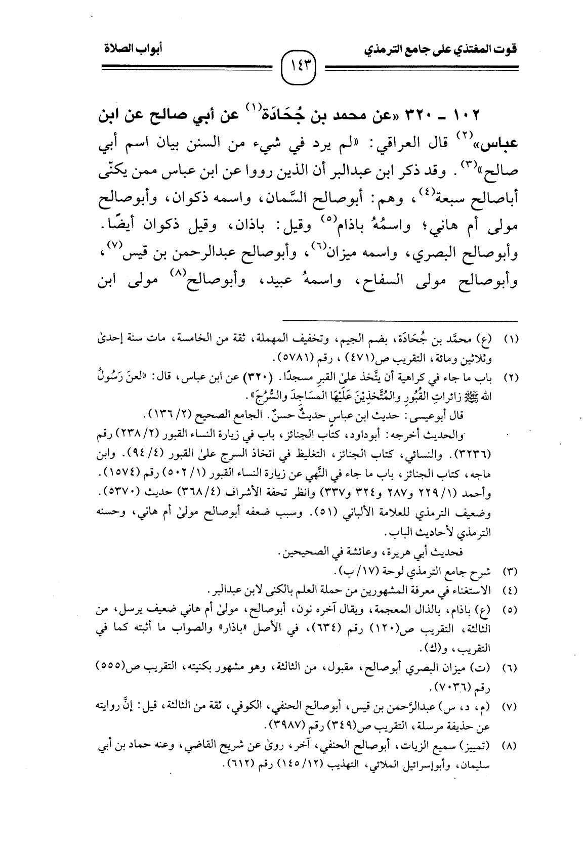 102 -[320] " عن محمد بن جُحَادَة (¬1) عن أبي صالح عن ابن عباس " (¬2) قال العراقي: " لم يرد في شيء من السنن بيان اسم أبي صالح " (¬3) . وقد ذكر ابن عبد البر أن الذين رووا عن ابن عباس ممن يكنّى أبا صالح سبعة (¬4) ، وهم: أبو صالح السَّمان، واسمه ذكوان، وأبو صالح مولى أم هاني؛ واسمُهُ باذام (¬5) وقيل: باذان، وقيل ذكوان أيضًا.