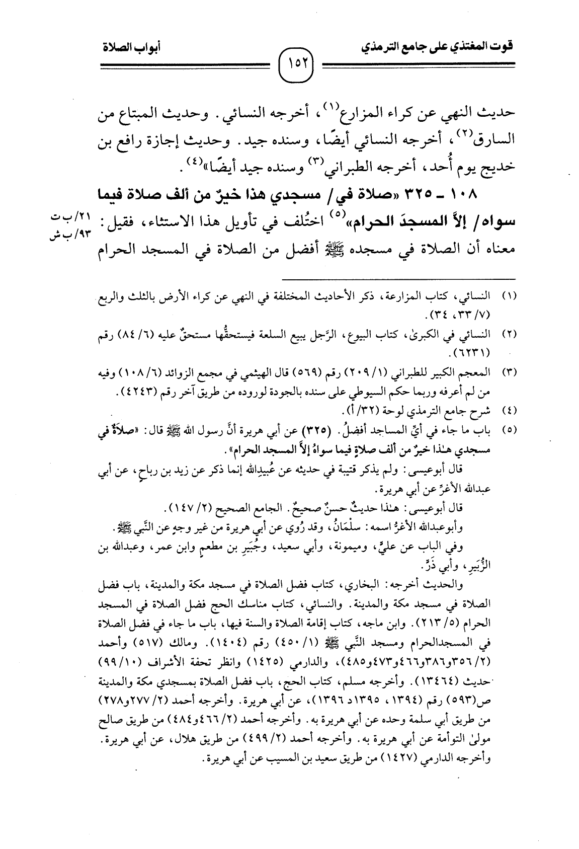 (¬1) باب ما جاء في أيِّ المساجد أفضلُ. (325) عن أبي هريرة أن رسول الله - صَلَّى اللَّهُ عَلَيْهِ وَسَلَّمَ - قال: " صلاةٌ في مسجدي هذا خيرٌ من ألف صلاةٍ فيما سواهُ إلاَّ المسجد الحرام ".