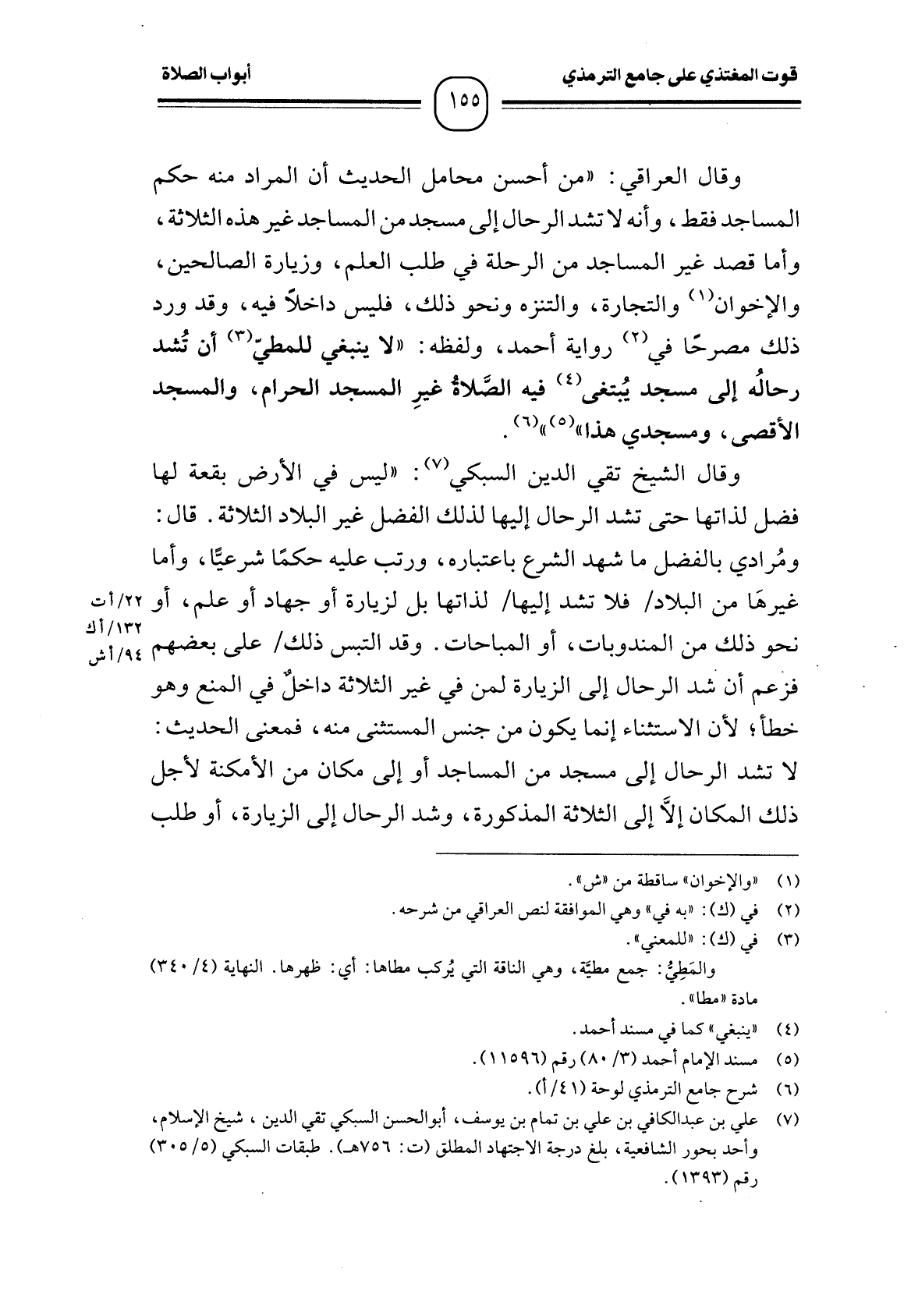 وقال العراقي: " من أحسن محامل الحديث أن المراد منه حكم المساجد فقط، وأنه لا تشد الرحال إلى مسجد من المساجد غير هذه الثلاثة، وأما قصد غير المساجد من الرحلة في طلب العلم، وزيارة الصالحين، والإخوان (¬1) والتجارة، والتنزه ونحو ذلك، فليس داخلاً فيه، وقد ورد ذلك مصرحًا في (¬2) رواية أحمد، ولفظه: " لا ينبغي للمطيّ (¬3) أن تُشد رحالُه إلى مسجد يُبتغى (¬4) فيه الصَّلاةُ غيرِ المسجد الحرام، والمسجد الأقصى، ومسجدي هذا " (¬5) " (¬6) .