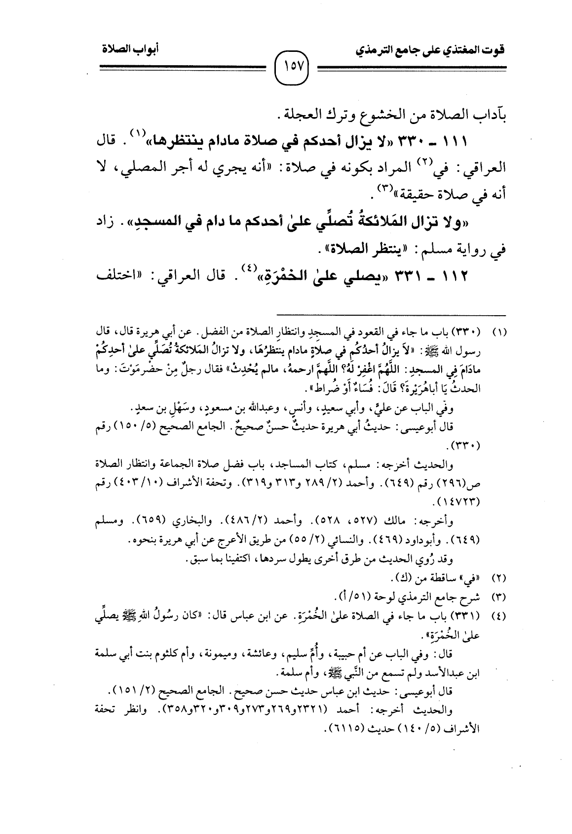 111 -[330] " لا يزال أحدكم في صلاة ما دام ينتظرها " (¬1) . قال العراقي: في (¬2) المراد بكونه في صلاة: " أنه يجري له أجر المصلي، لا أنه في صلاة حقيقة " (¬3) .