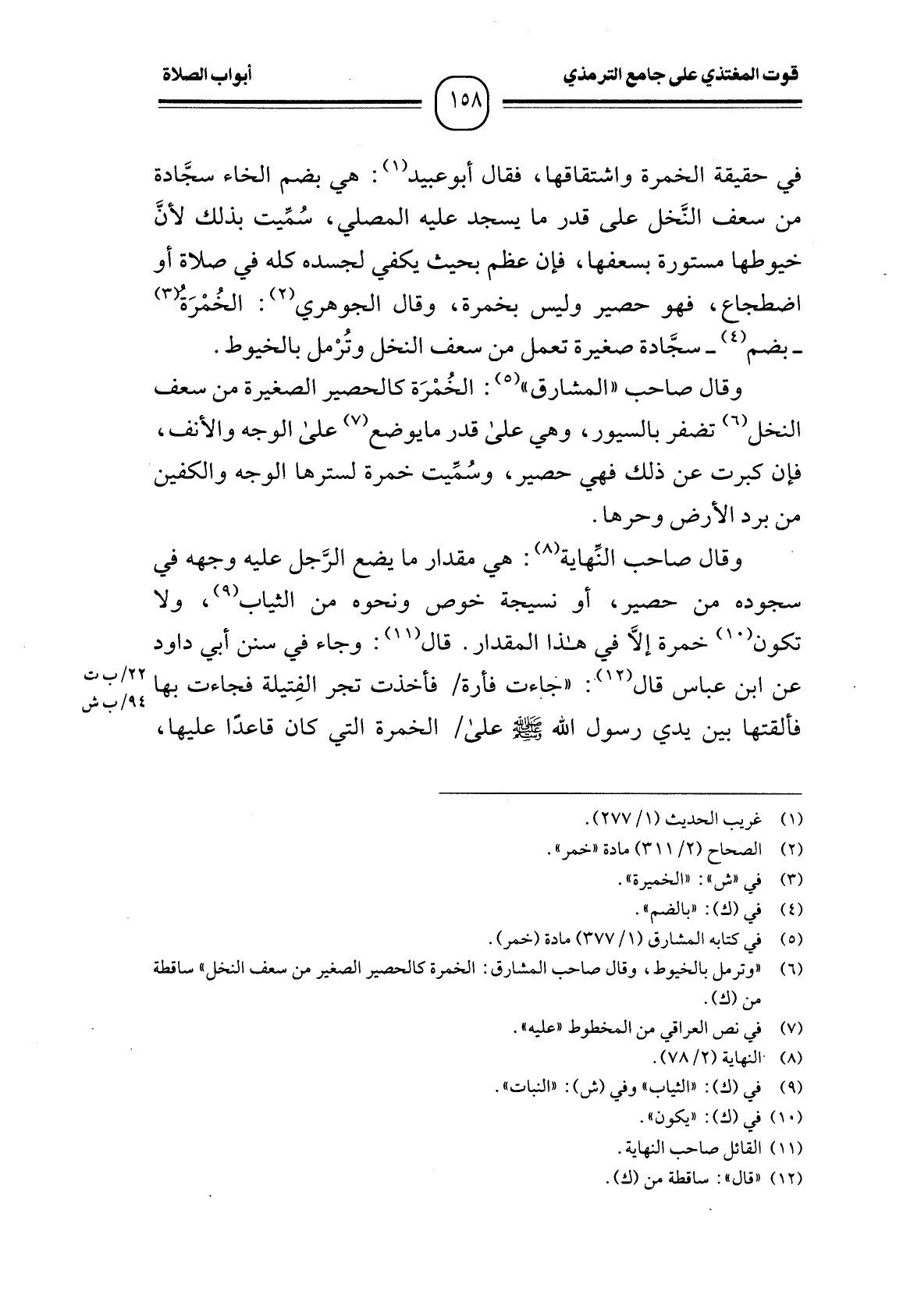 وقال صاحب النِّهاية (¬8) : هي مقدار ما يضع الرَّجل عليه وجهه في سجوده من حصير، أو نسيجة خوص ونحوه من الثياب (¬9) ، ولا تكون (¬10) خمرة إلاَّ في هذا المقدار. قال (¬11) : وجاء في سنن أبي داود عن ابن عباس قال (¬12) : "جاءت فأرة فأخذت تجر الفِتيلة فجاءت بها فألقتها بين يدي رسول الله - صَلَّى اللَّهُ عَلَيْهِ وَسَلَّمَ - على الخمرة التي كان قاعدًا عليها،