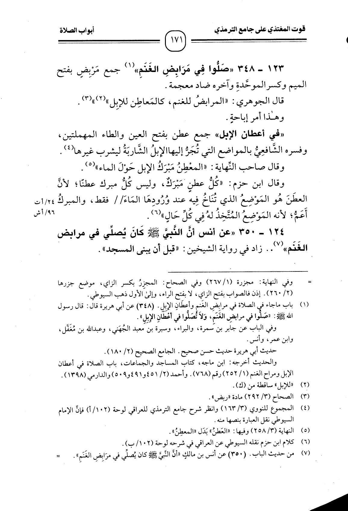 123 -[348] " صَلُّوا فِي مَرَابِضِ الغَنَمِ " (¬1) جمع مَرْبِضٍ بفتح الميم وكسر الموحَّدةِ وآخره ضاد معجمة.